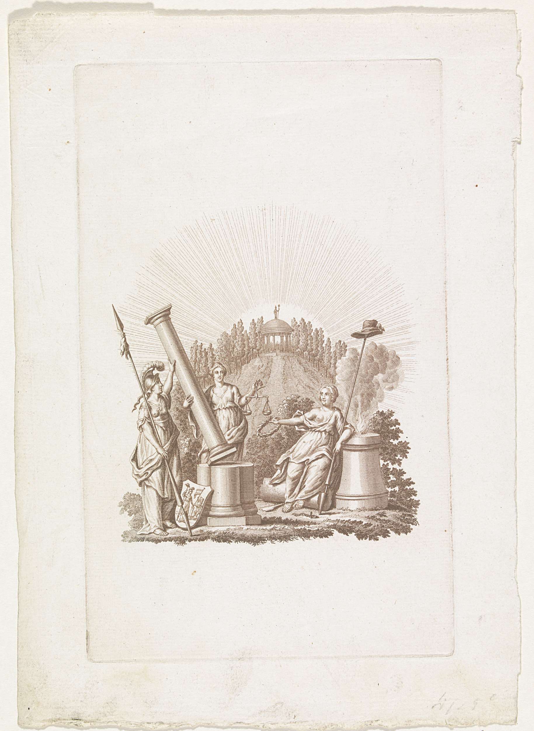 Gegraveerd titelblad voor een Duitse vertaling van de grondwet van de Bataafse Republiek. Justitia en Minerva plaatsen de zuil der constitutie van 1798 op het voetstuk Vrijheid, Gelijkheid en Broederschap, met rechts de Nederlandse Maagd met de vrijheidshoed op een speer. Op de achtergrond een tempel op een heuvel.
