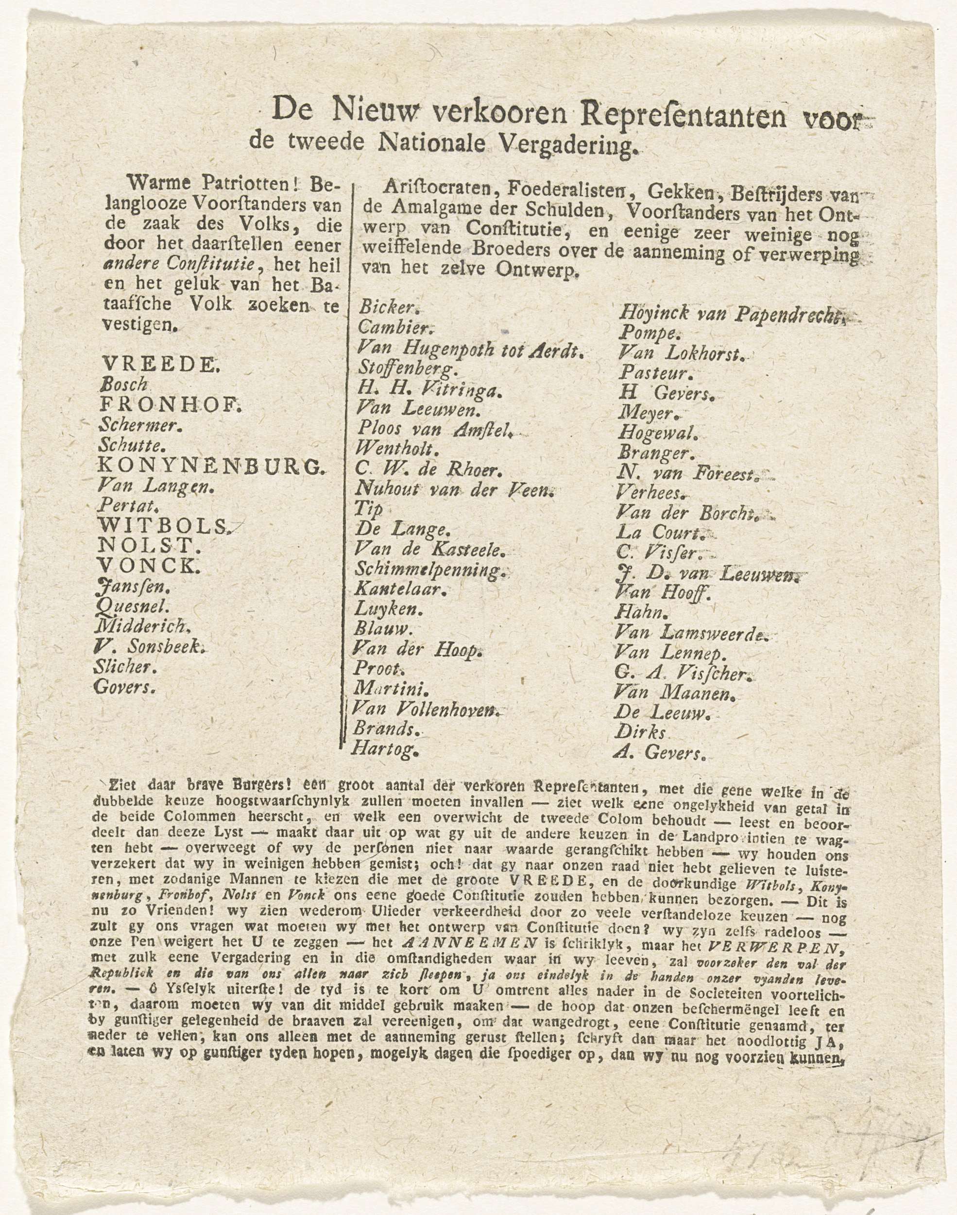 Tekstblad met een lijst van de namen van de nieuw gekozen Representanten voor de Tweede Nationale Vergadering, 1797-1798. De Tweede Nationale Vergadering bestond tussen 1 september 1797 en 22 januari 1798. Links een lijst van 'Warme Patriotten', rechts twee kolommen met namen van 'Aristocraten, Foederalisten, Gekken ...'.