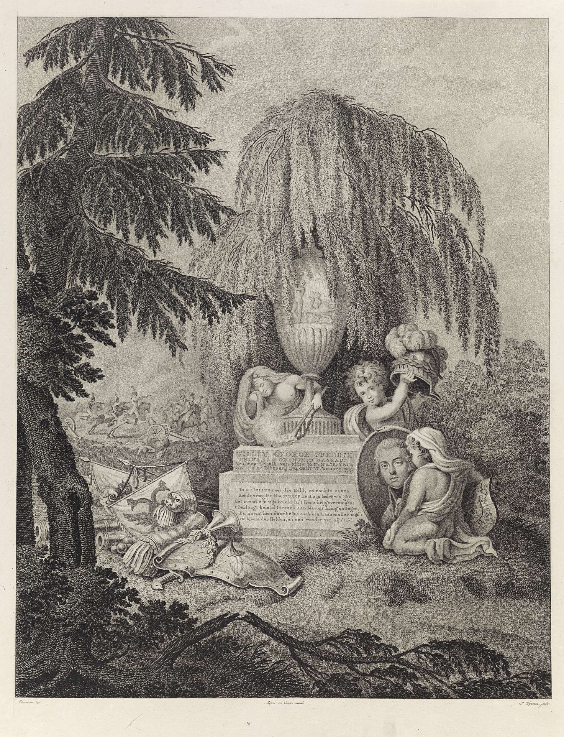 Allegorisch gedenkteken voor Willem George Frederik, prins van Oranje-Nassau, overleden te Padua, 6 januari 1799. Monument met urn overschaduwd door een treurwilg, putti met gedoofde toorts, helm en portret. Op het voetstuk een zesregelig vers. Op de grond voor het monument een wapenrusting en vaandels, op de achtergrond een ruitergevecht.