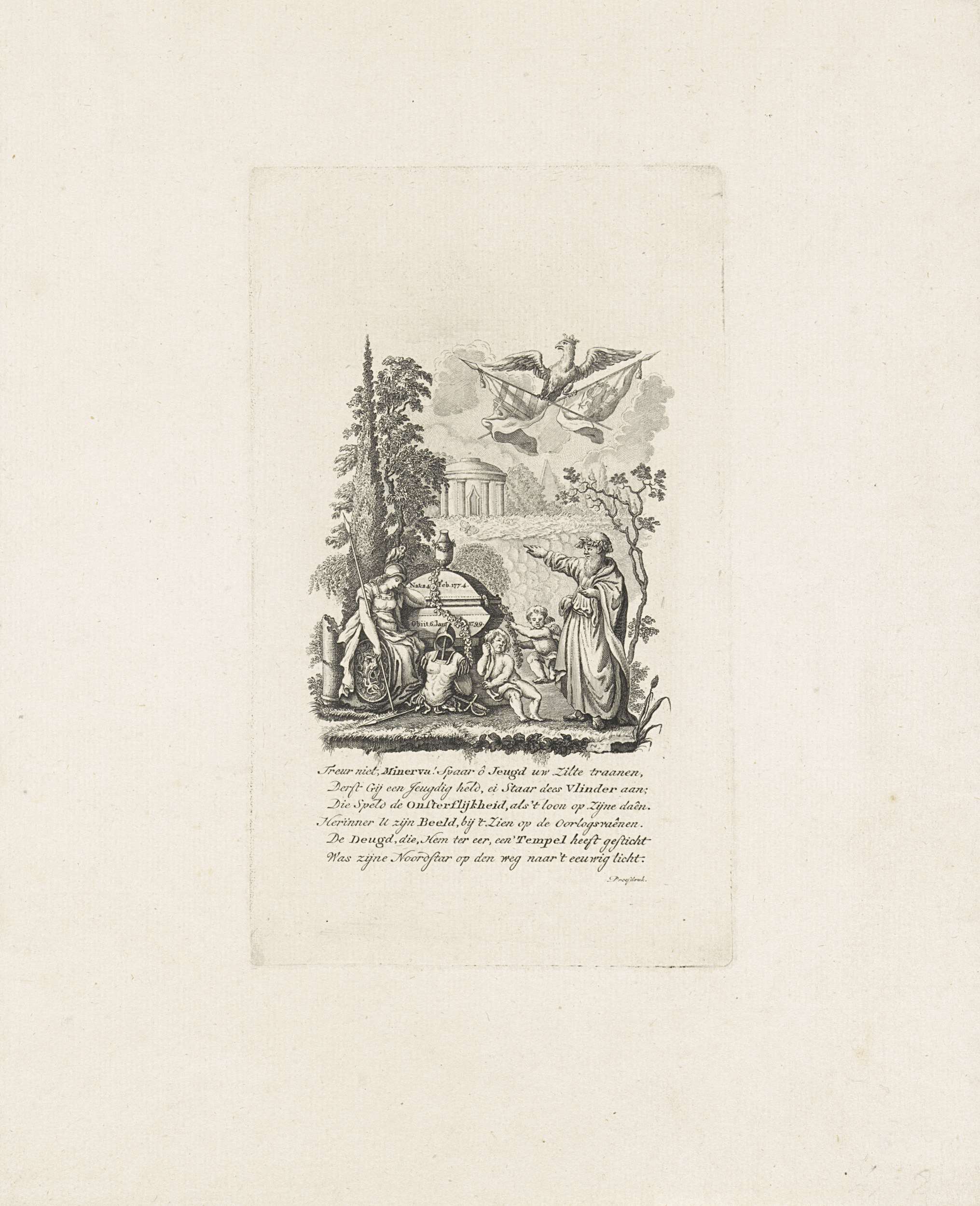 Allegorisch grafmonument voor Willem George Frederik, prins van Oranje-Nassau, overleden te Padua, 6 januari 1799. Minerva en putti treurend bij het graf worden getroost door een wijsgeer die wijst op de tempel van onsterfelijkheid. Met zesregelig onderschrift.