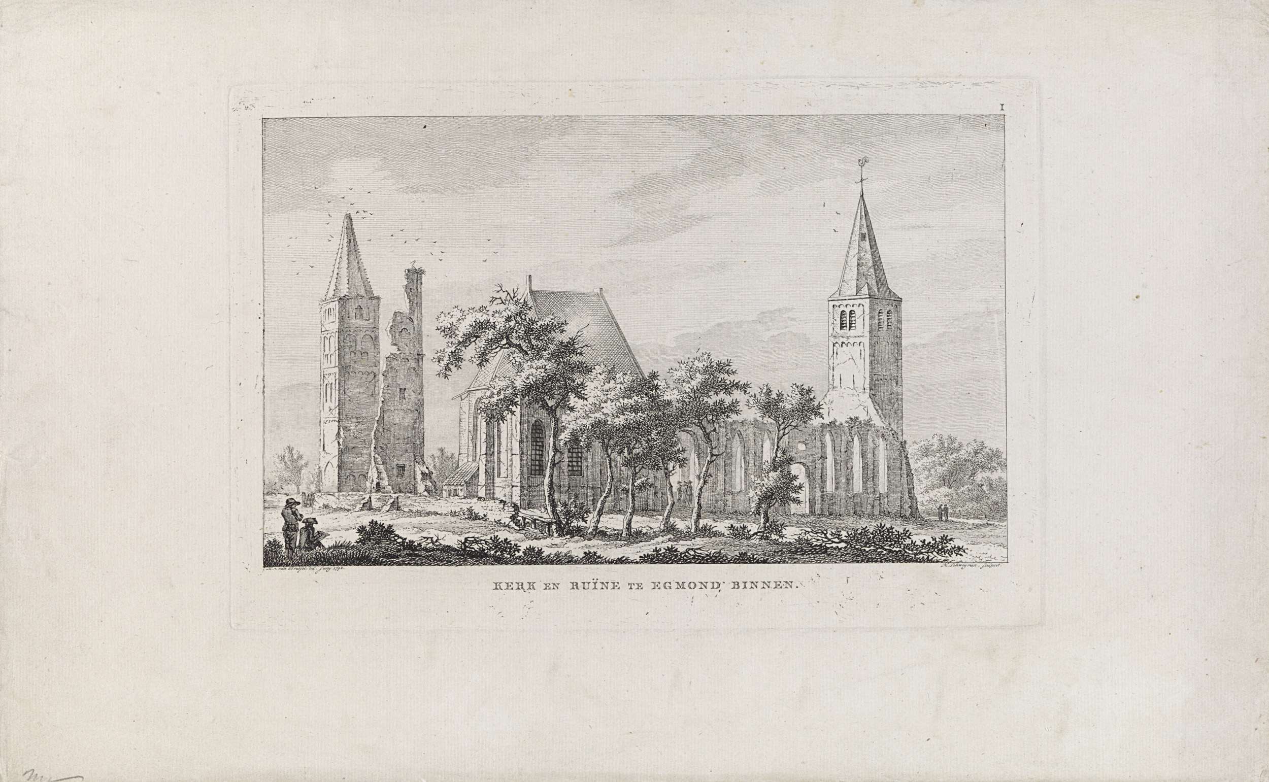 Gezicht op de ruïne van de Abdijkerk met toren te Egmond-Binnen, in welstand in juni 1798 vóór het instorten op 18 december 1798. Links op de voorgrond een zittende tekenaar. Genummerd rechtsboven: I. Zie pendant.