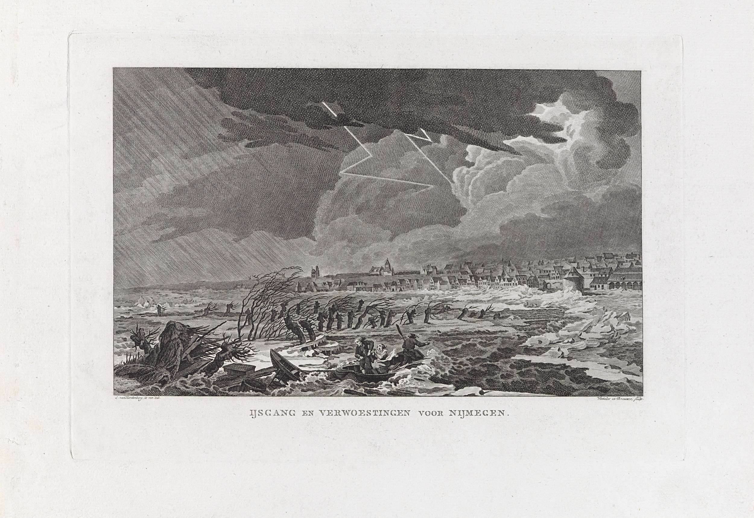 Zware storm en kruiend ijs op de Waal bij Nijmegen, februari 1799. Onderdeel van een groep van zes platen van dijkdoorbraken en watersnood in het zuidelijk deel van Gelderland in februari 1799.