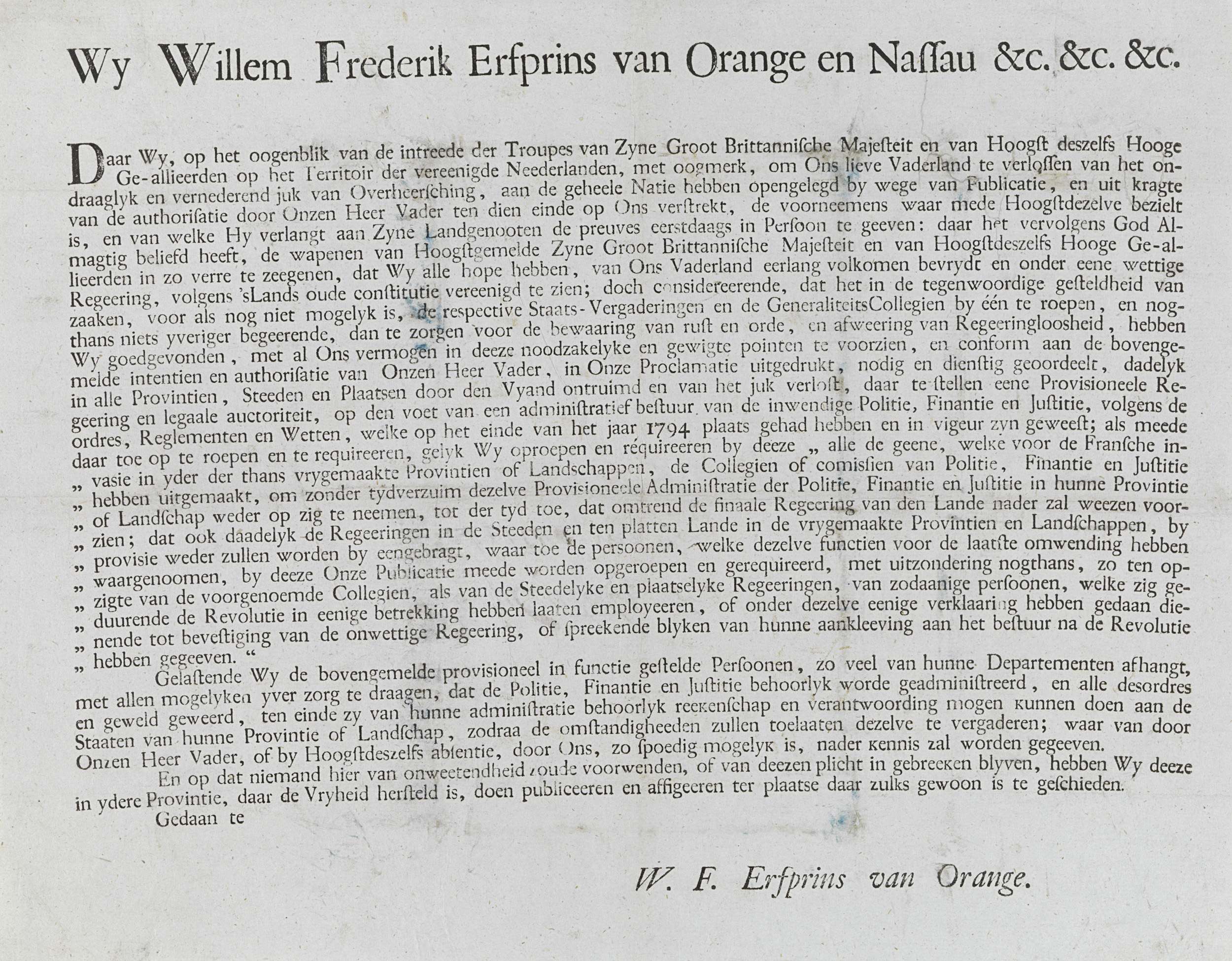 Proclamatie van erfprins Willem bij de Brits-Russische inval in de Nederlanden, 1799
