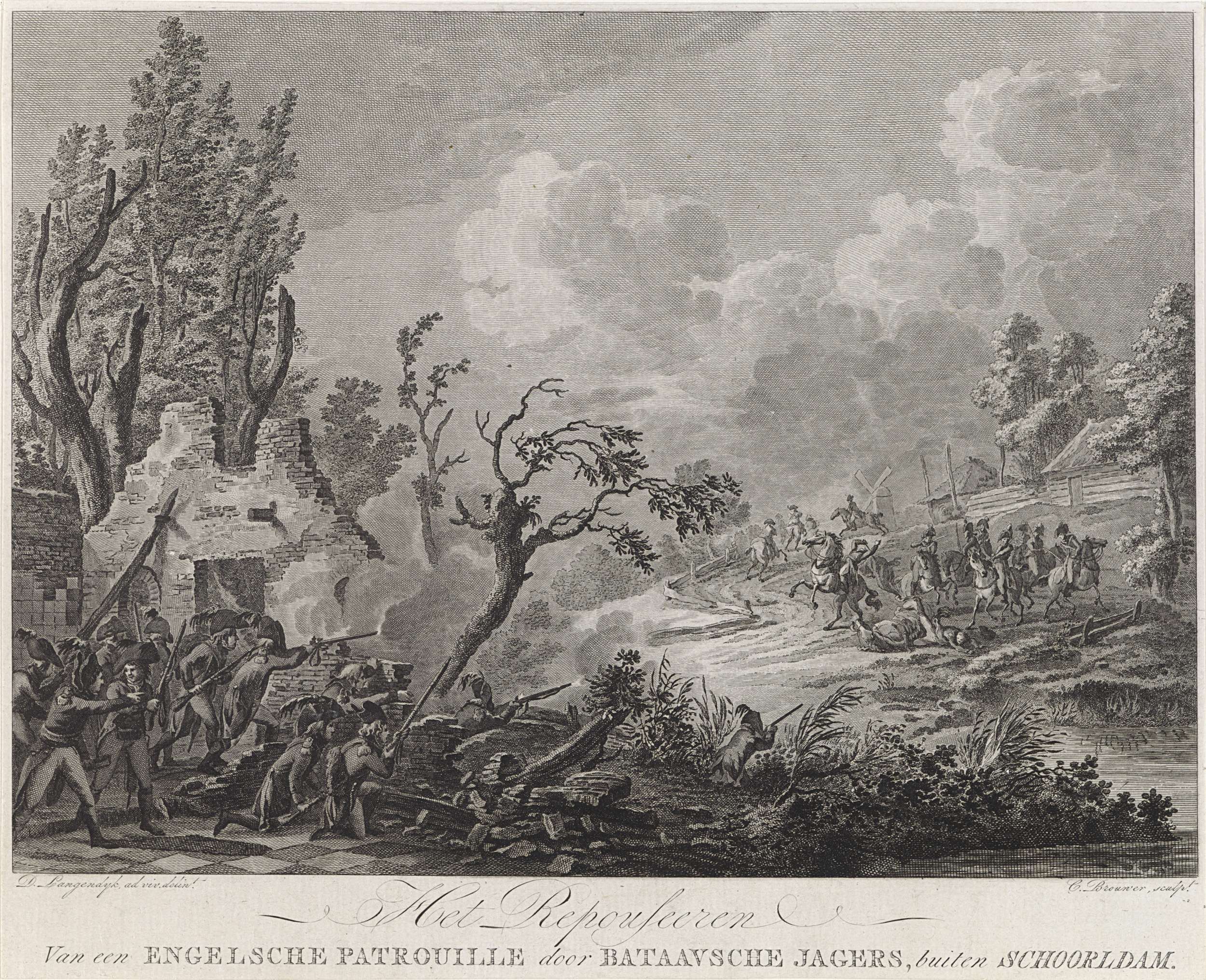 Een Britse patrouille wordt door Bataafse jagers onder vuur genomen, bij Schoorldam, 1799. Vanachter de ruïnes van een gebouw schieten de soldaten op de Britse ruiters.