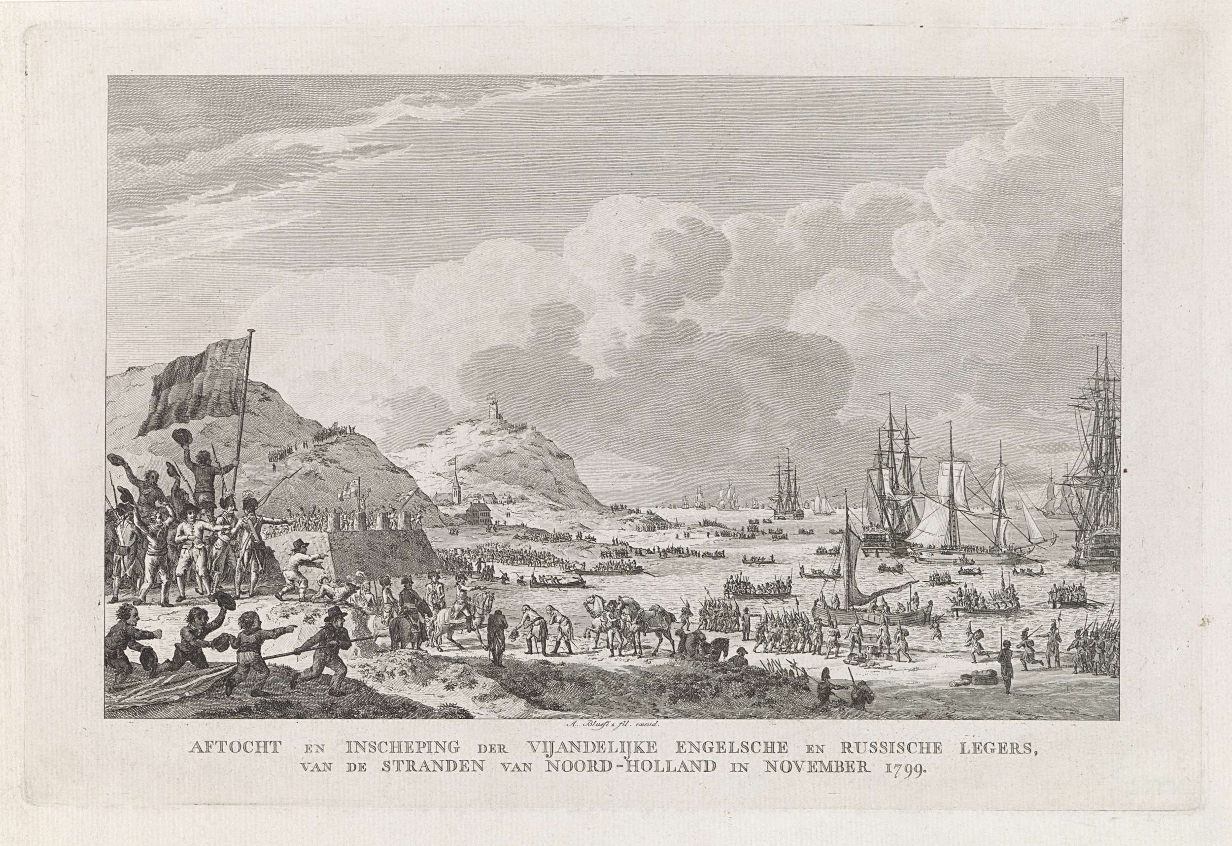 Het vertrek van de Britse en Russische troepen vanaf het strand bij Den Helder in sloepen naar gereedliggende schepen, 29 november 1799. Terwijl de commandanten elkaar groeten wordt de Bataafse vlag gehezen en slepen jongetjes de Britse vlag over de grond. Zie ook de pendant.
