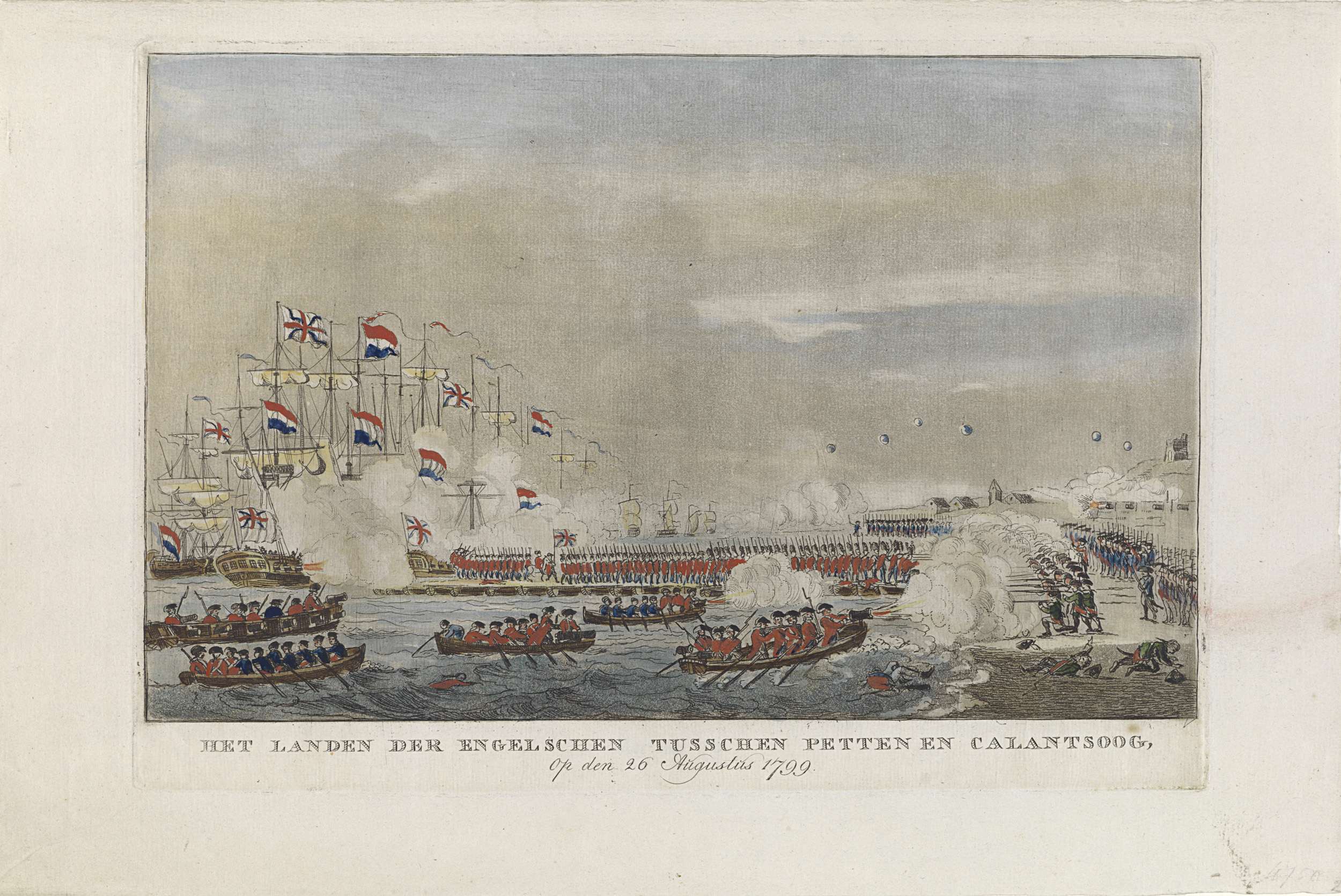 De landing van de Britse invasiemacht aan de kust bij Callantsoog, 27 augustus 1799. Troepen komen met sloepen en over een schipbrug naar de kust. Vanaf het strand vuren de Bataafse soldaten op de landingstroepen. Zie ook de pendant.