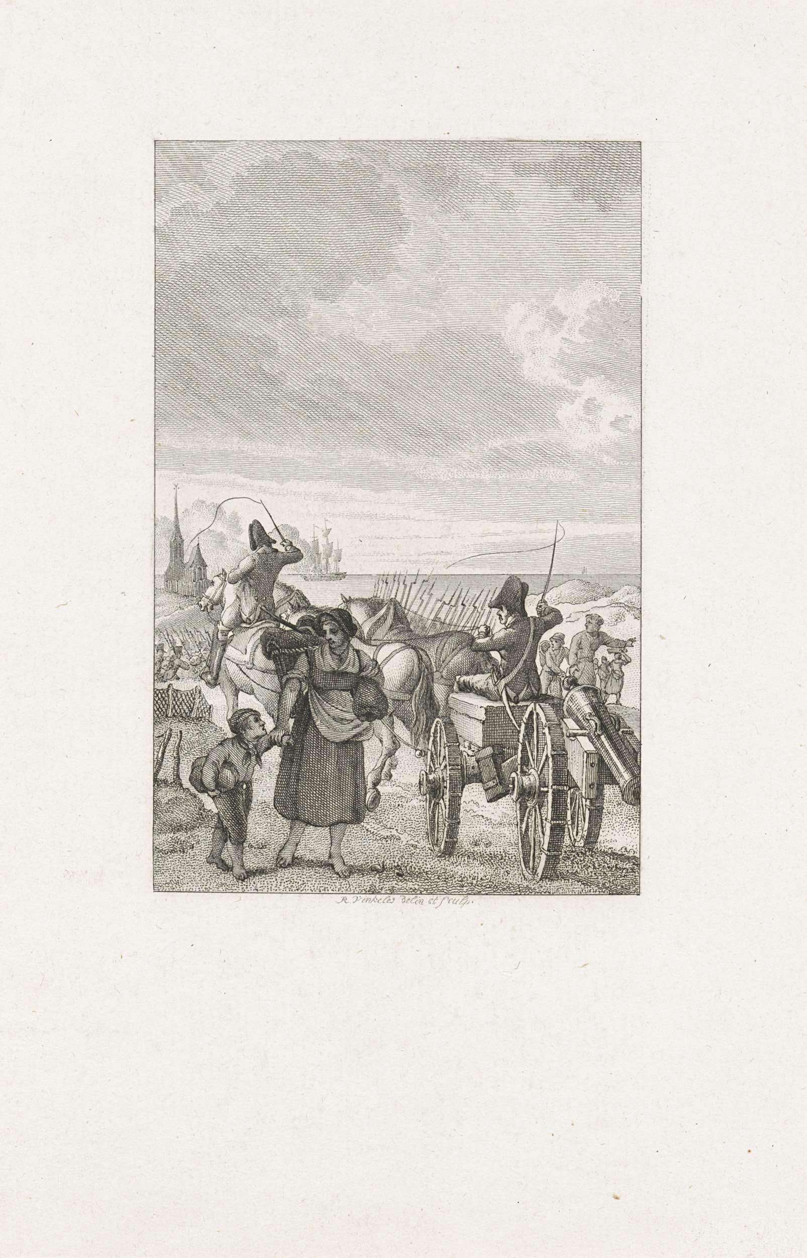 Soldaten van de Brits-Russische invasiemacht brengen met stuk geschut getrokken door vier paarden naar Den Helder op 29 november 1799. Onderweg passeren zij een vrouw met kind.
