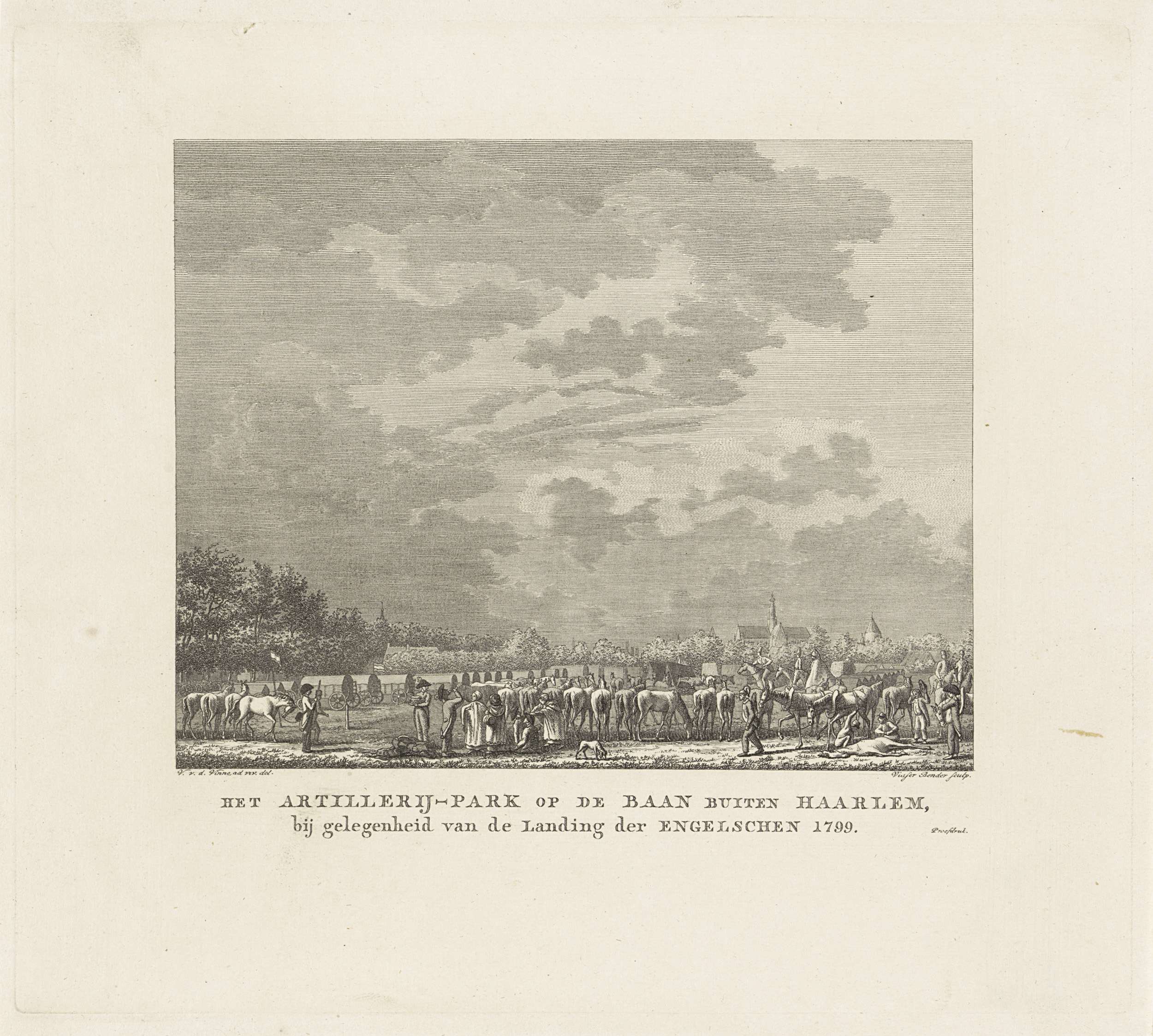 Legerkamp met artillerie, buiten Haarlem, ten tijde van de Brits-Russische invasie in 1799. Paarden en wagens, manschappen en enkele vrouwen, in de verte de stad.