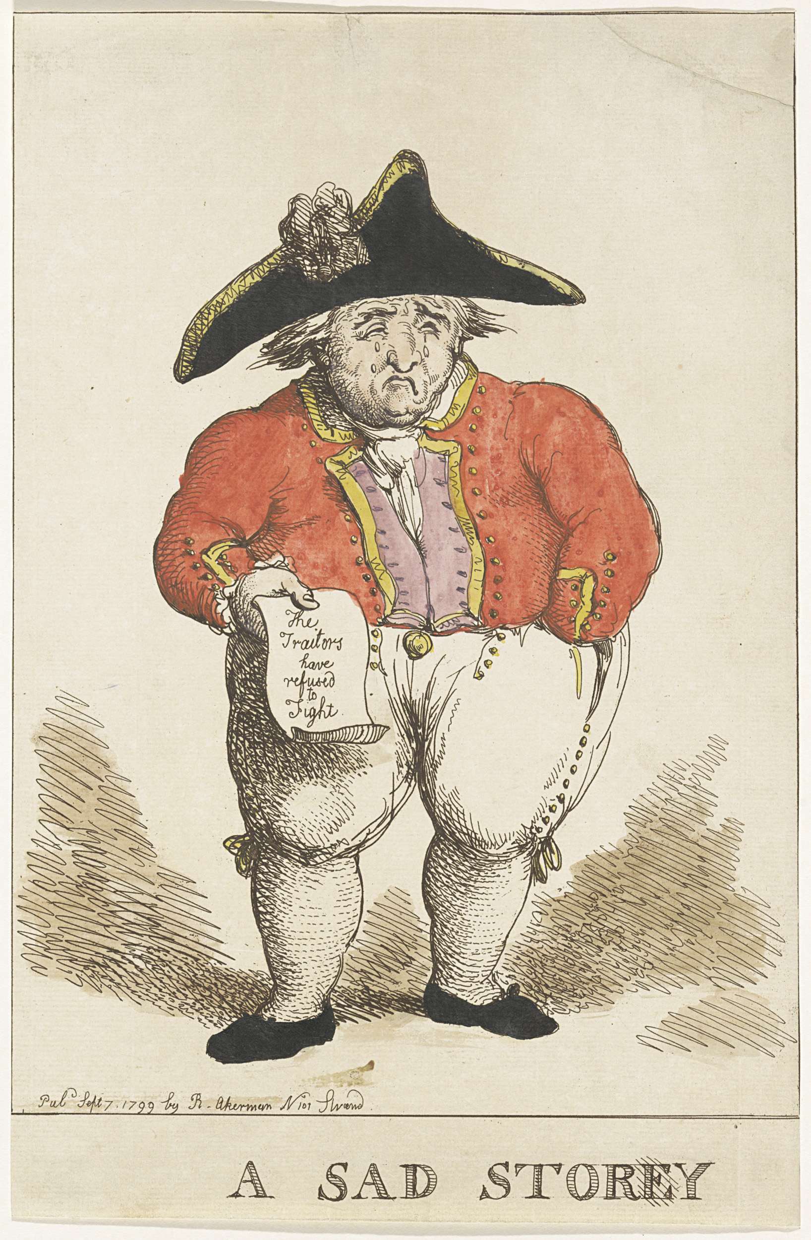 Spotprent op de Bataafse schout-bij-nacht Samuel Story. Story was commandant van het eskader van de Bataafse vloot dat zich, na muiterij onder de Oranjegezinde bemanning, zonder een schot te lossen overgaf aan de Britten op 30 augustus 1799. Deze gebeurtenis staat bekend als het Vlieter-incident. De huilende Story met in zijn rechterhand een papier waarop ...