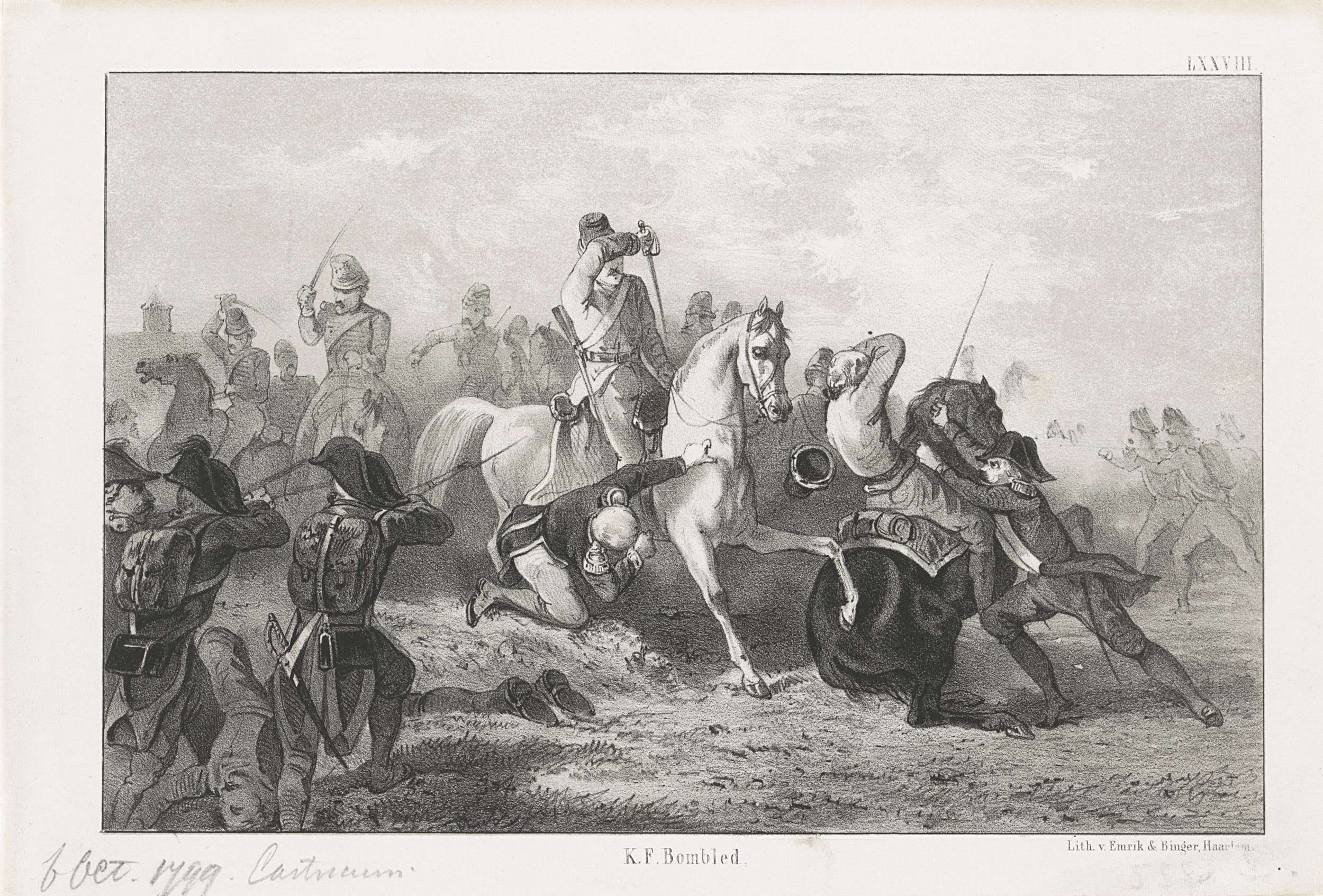 Gevechten bij Castricum tussen het Frans-Bataafse leger en de Brits-Russische invasiemacht op 6 oktober 1799. Genummerd rechtsboven: LXXVIII.
