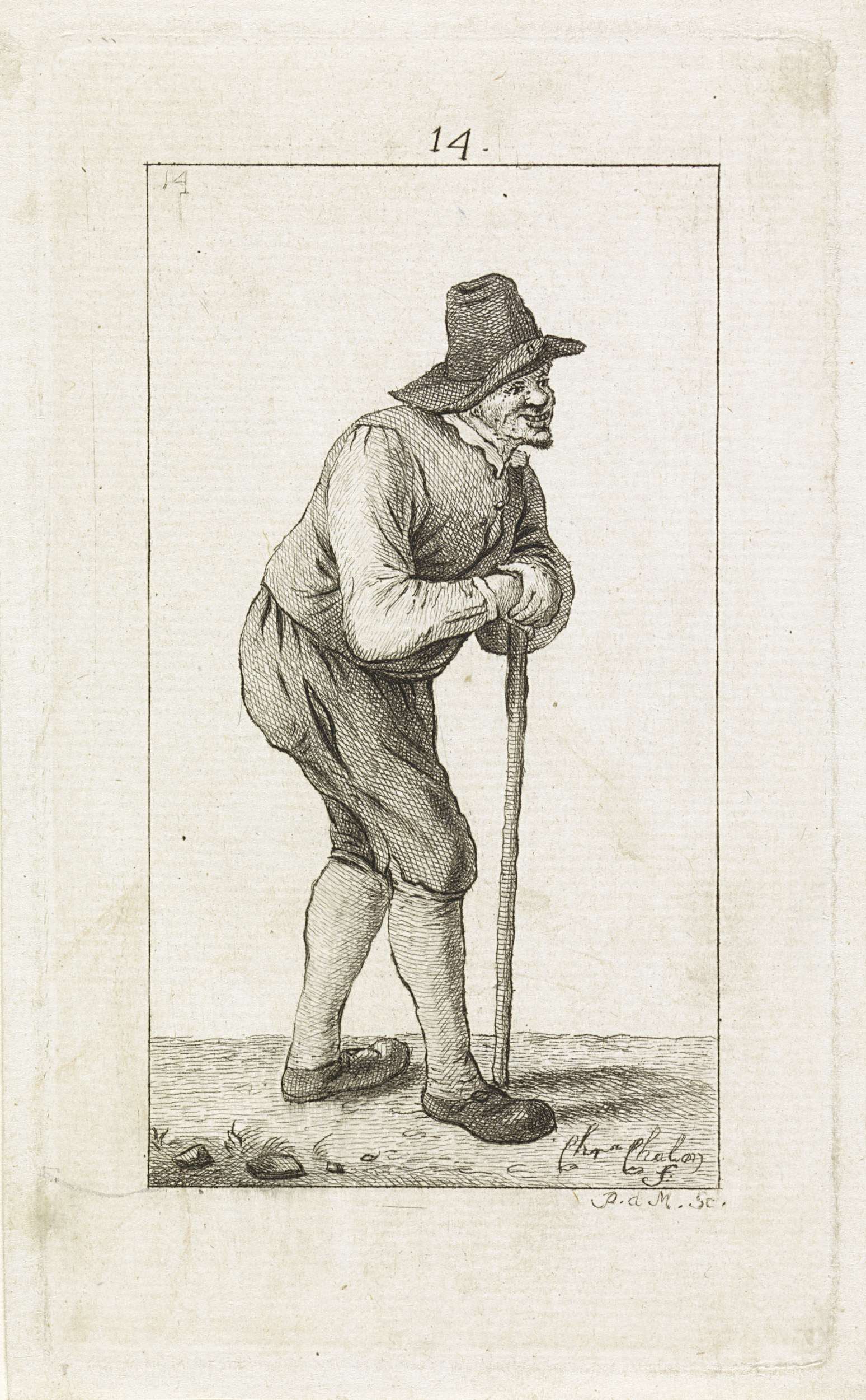 Man leunend op een stok. Onderdeel van een reeks illustraties van volksklederdrachten uit 1779.