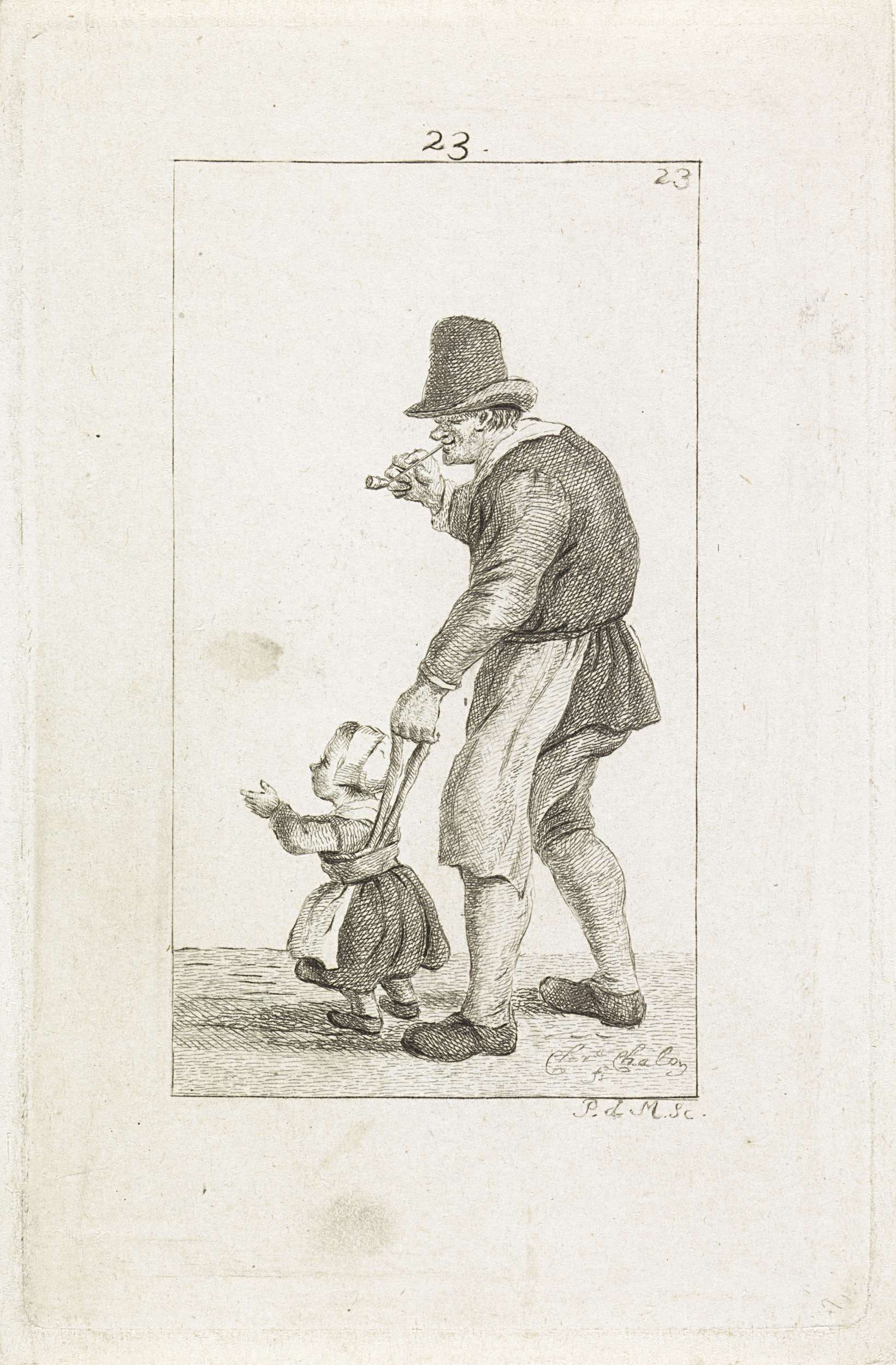 Man wandelend met een kind in een tuigje. Onderdeel van een reeks illustraties van volksklederdrachten uit 1779.