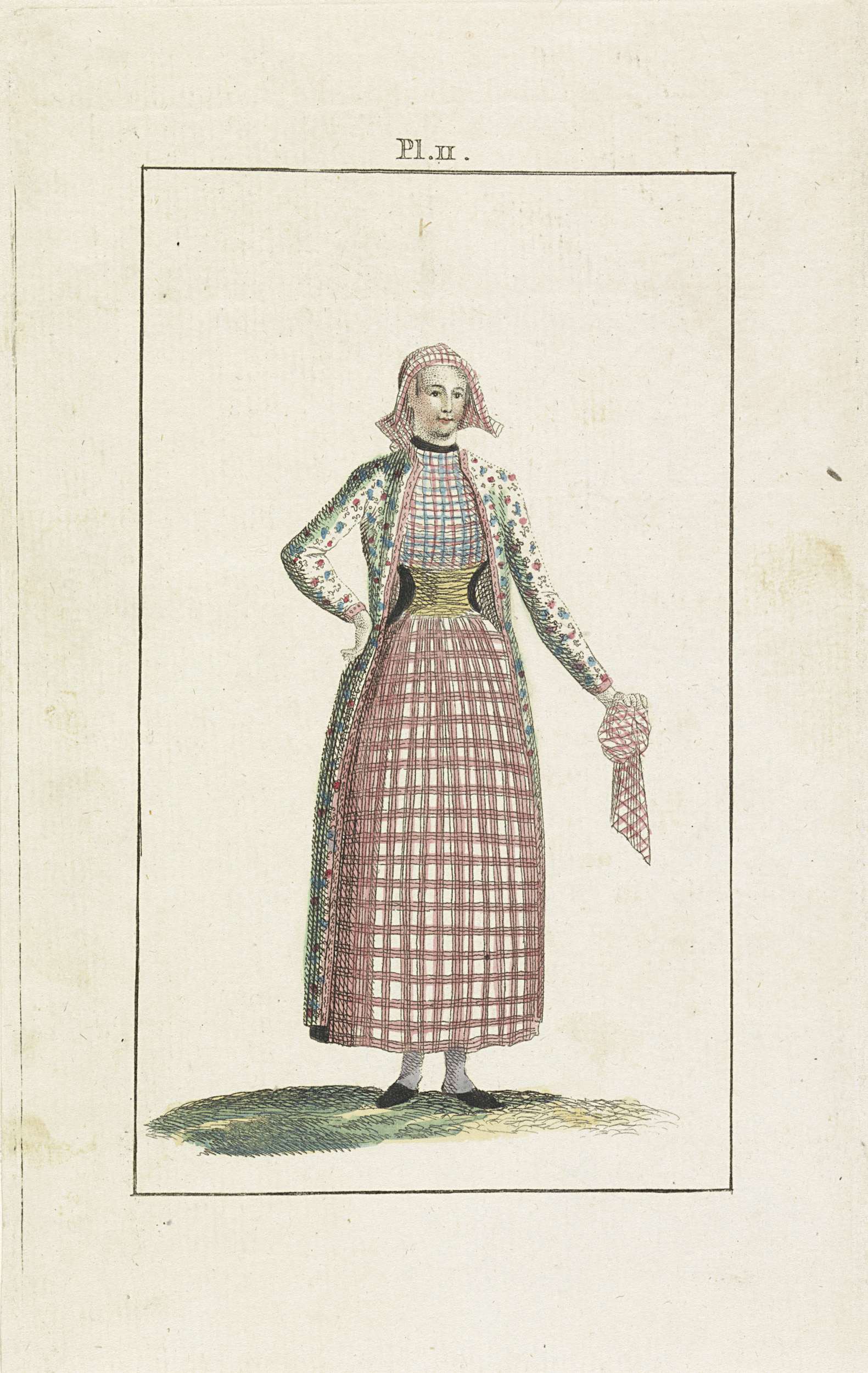 Klederdracht van een vrouw uit Hindeloopen. Plaat II in een reeks van vier illustraties van klederdrachten in Nederland in 1792.
