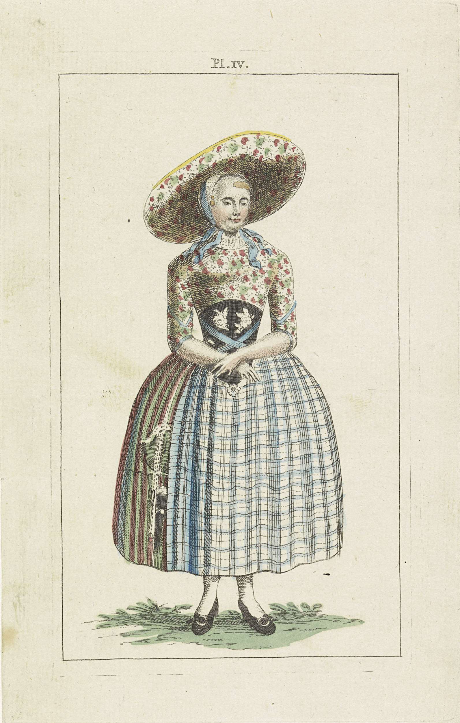 Klederdracht van een vrouw uit Zaandam. Plaat IV in een reeks van vier illustraties van klederdrachten in Nederland in 1792.
