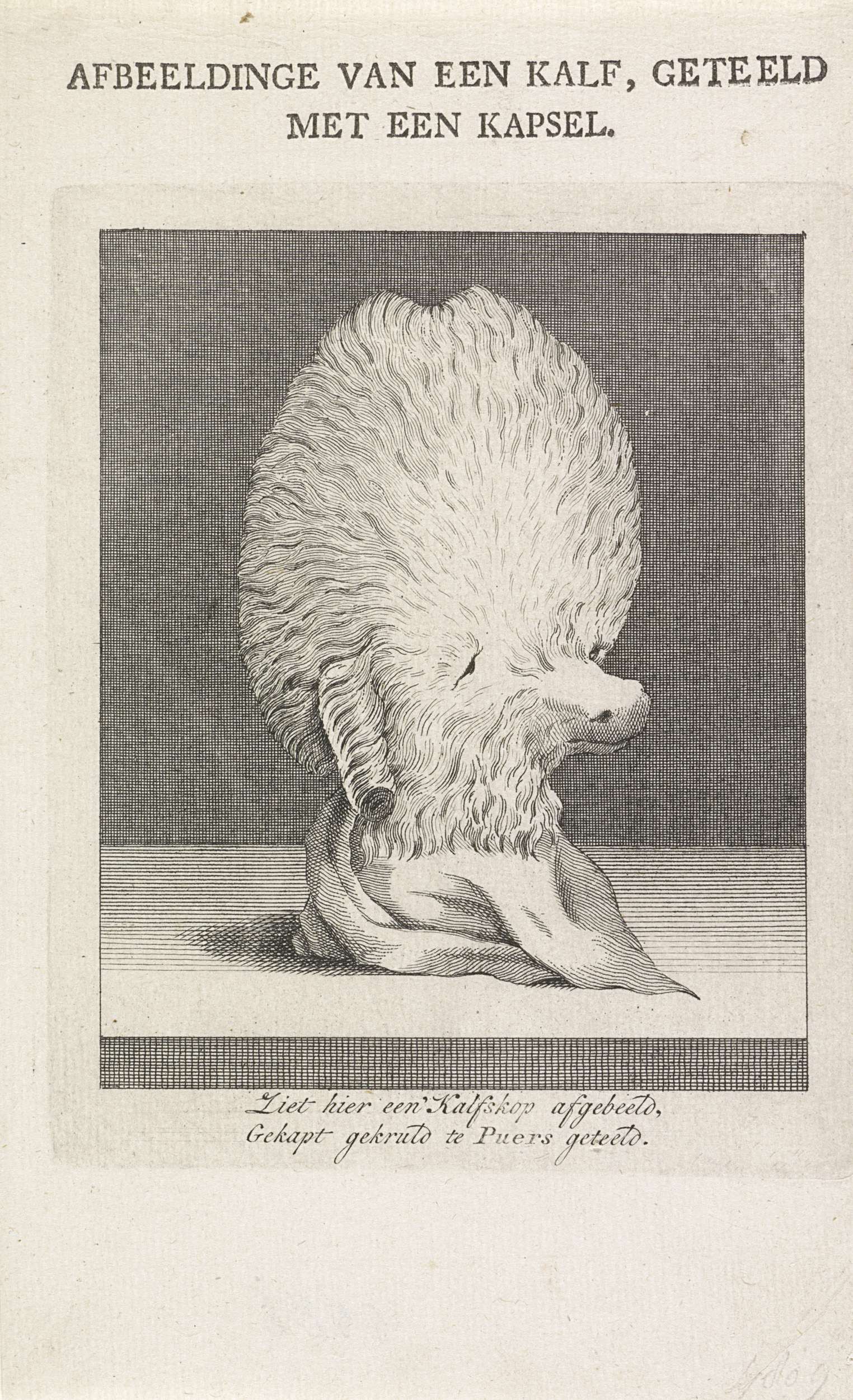 Een kalfskop met vacht gelijkend op een kapsel. Geboren in het dorp Puers in Brabant op 27 januari 1778. Satire op modieuze kapsels in Brabant in deze tijd. Onderaan een tweeregelig vers.