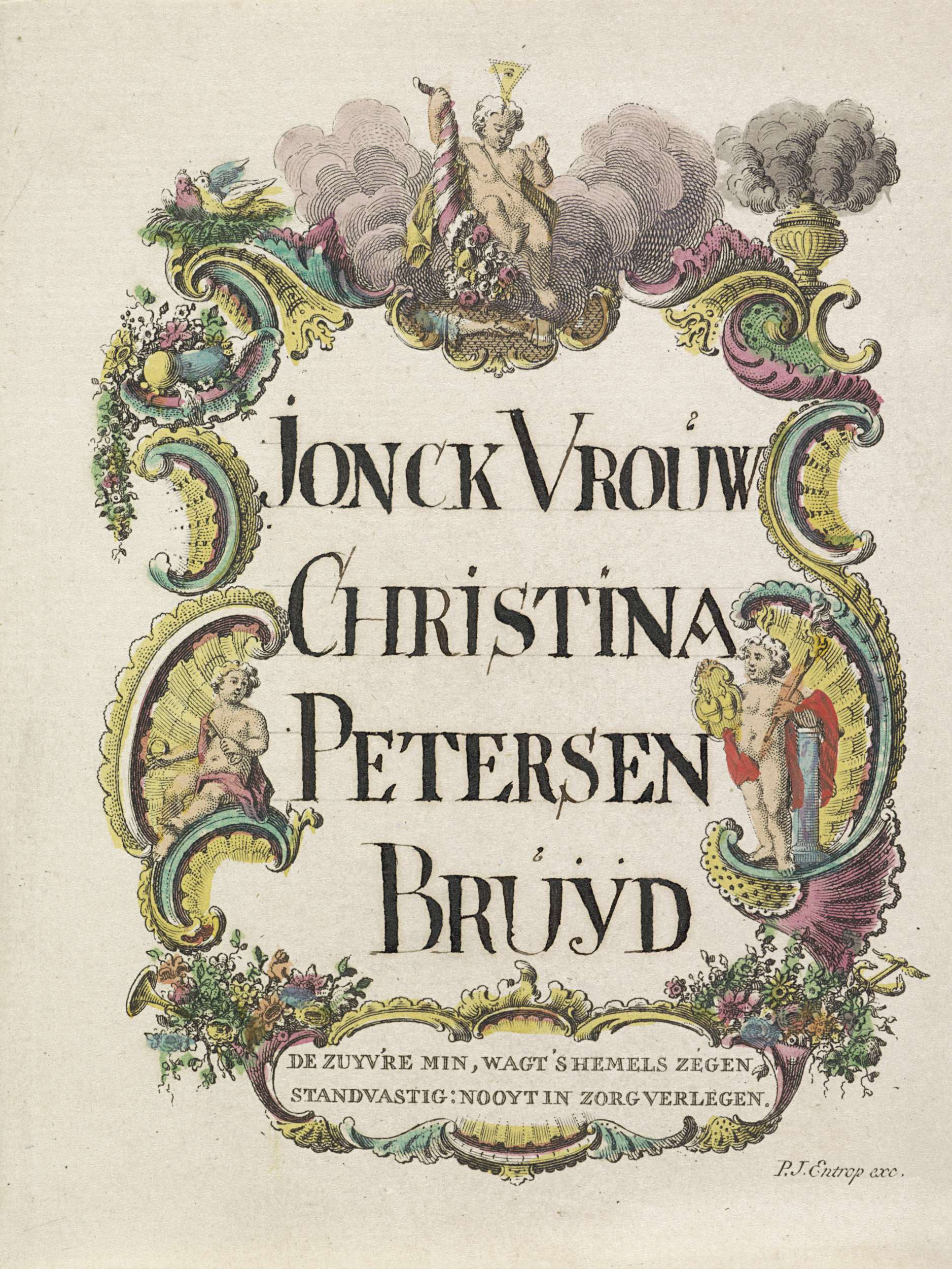 Versierde naamkaartje voor de bruid Christina Petersen, ca. 1760. Voorgedrukte omlijsting met rocailles en putti. Met tweeregelig onderschrift. Zie ook pendant.