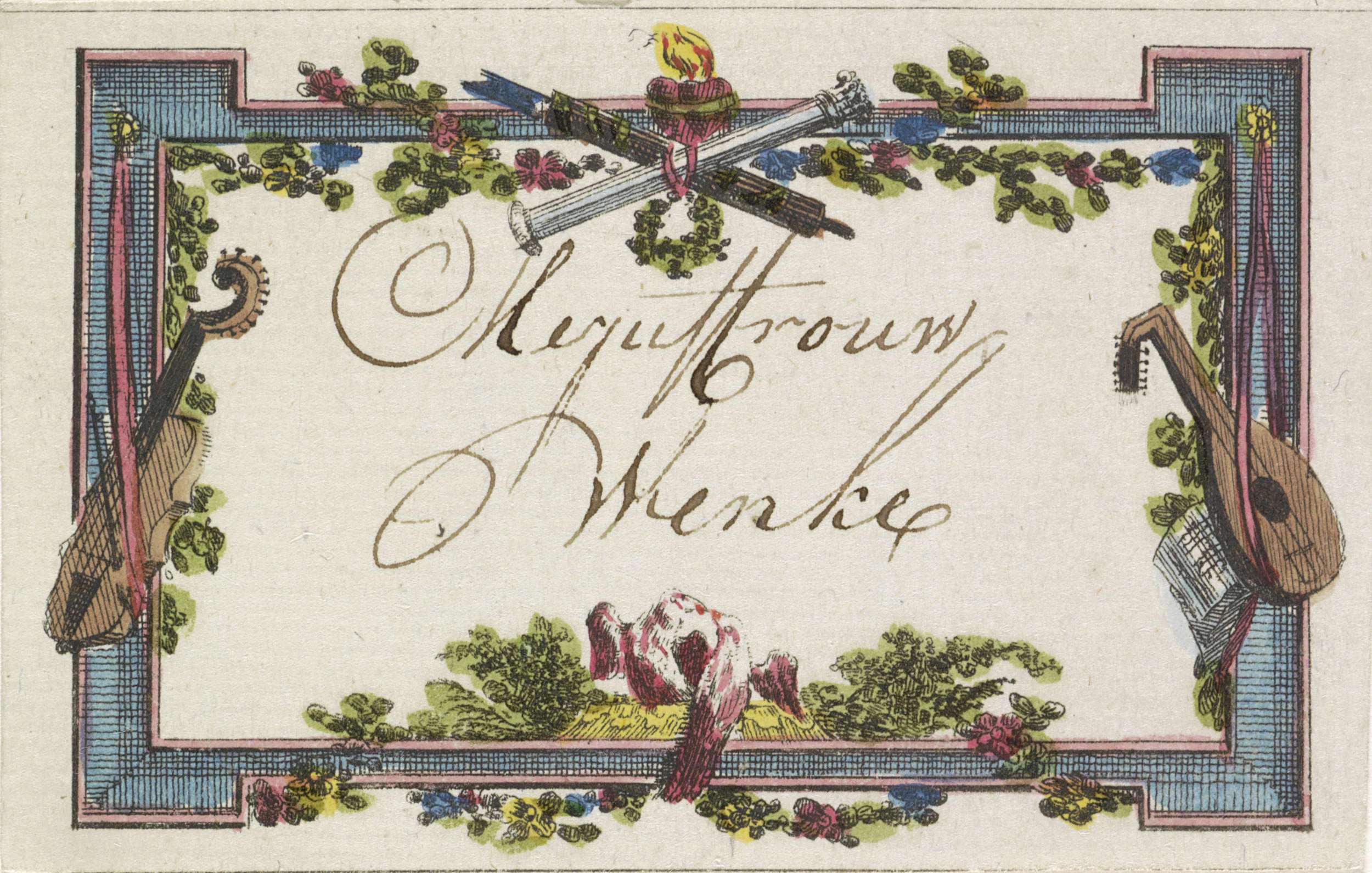Versierde naamkaartje voor mejuffrouw Wenke bij een diner, ca. 1770. Voorgedrukte omlijsting met muziekinstrumenten.