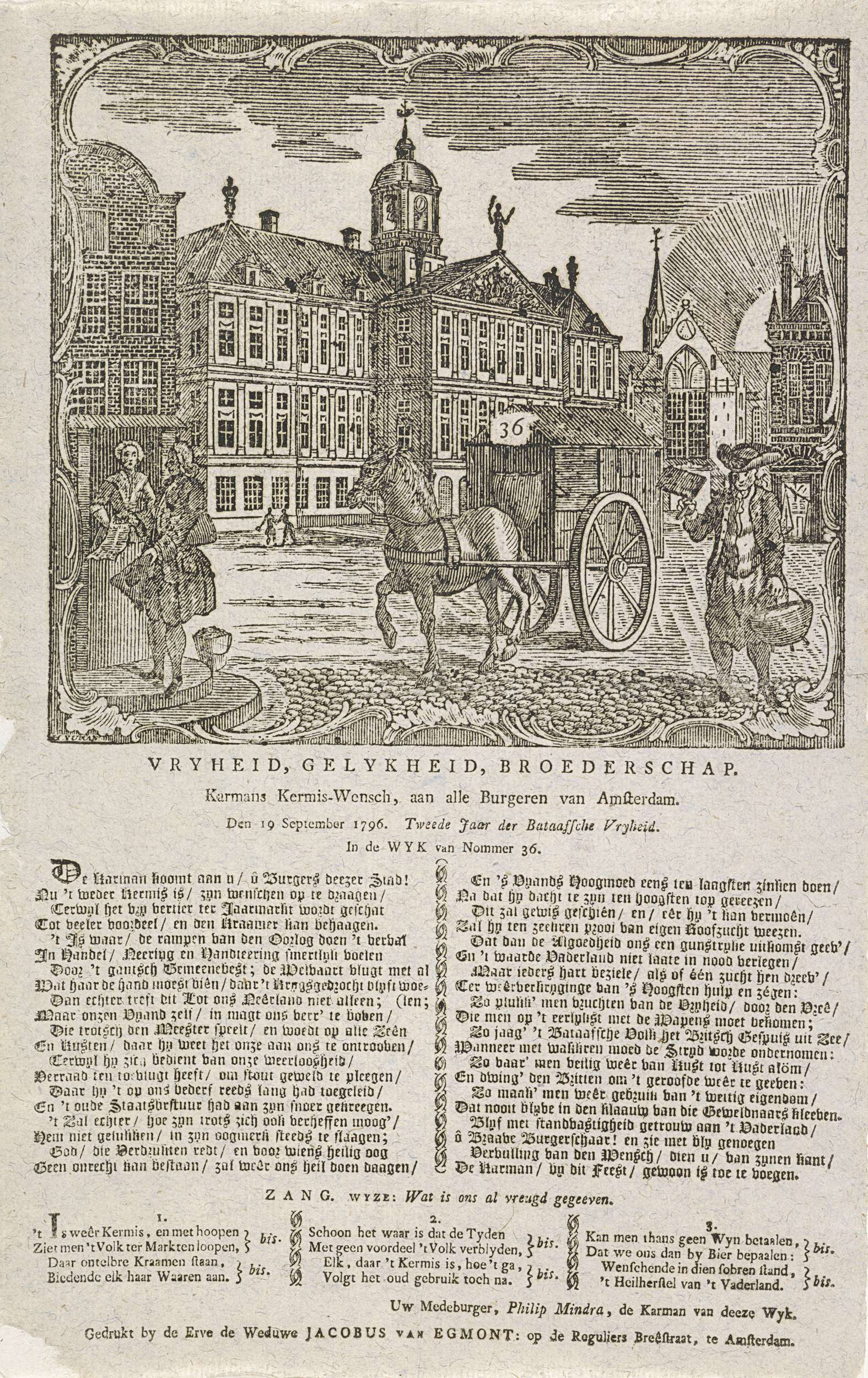 Kermisprent voor het jaar 1796 van Philip Mindra, de karrenman (askarrenman of vuilnisman) in de wijk 36, opgedragen aan de burgers van Amsterdam. Paard met askar gemerkt 36 op de Dam voor het Stadhuis. Op het blad onder de voorstelling een vers in twee kolommen met daaronder een lied in drie kolommen.