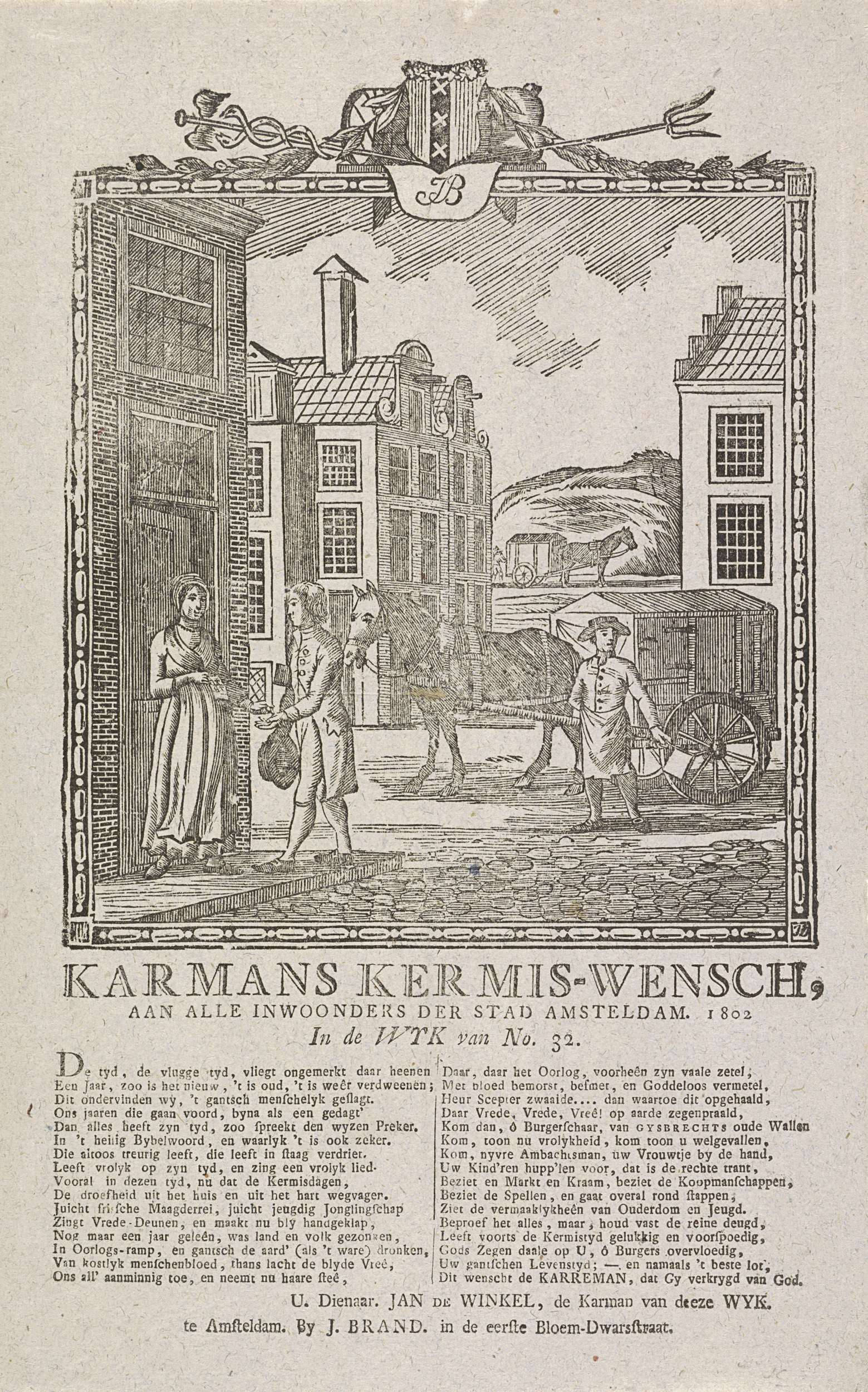 Kermisprent voor het jaar 1802 van Jan de Winkel, de karrenman (askarrenman of vuilnisman) in de wijk 32, opgedragen aan de burgers van Amsterdam. Karrenman met ratelaar en paard met askar in een straat. Bovenaan het wapen van Amsterdam en het monogram JB. Op het blad onder de voorstelling een vers in twee kolommen.