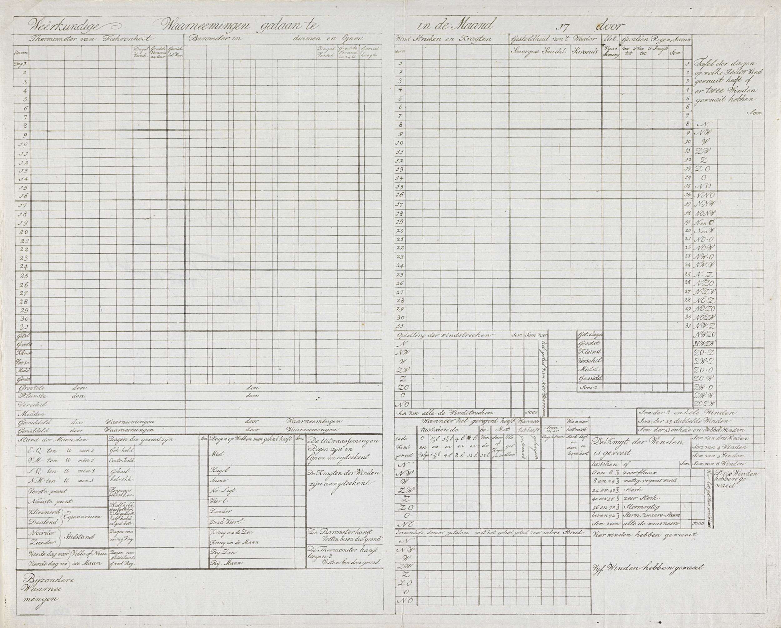 Tabel voor het invullen van weerkundige waarnemeningen, ca. 1790