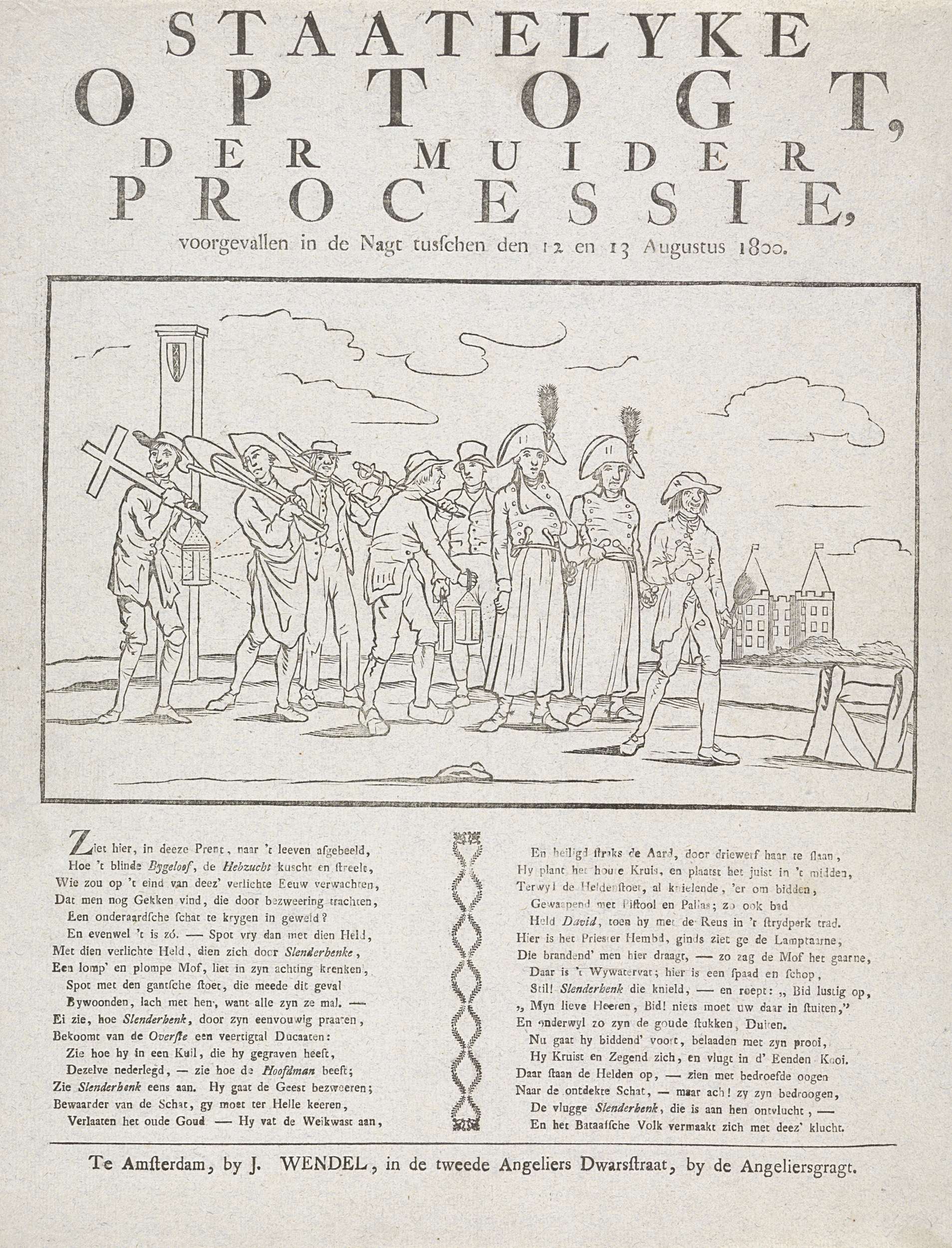 Optocht van de schatzoekers van Muiden naar de plaats van de vermeende schat. De Duitse oplichter leidt de stoet. Illustratie van het verhaal van het bedrog van de bijgelovige katholieke luitenant-kolonel Dirk Cornelis van der Meulen door een Duitse oplichter, te Muiden in de nacht van 12 op 13 augustus 1800. Op de achtergrond het ...
