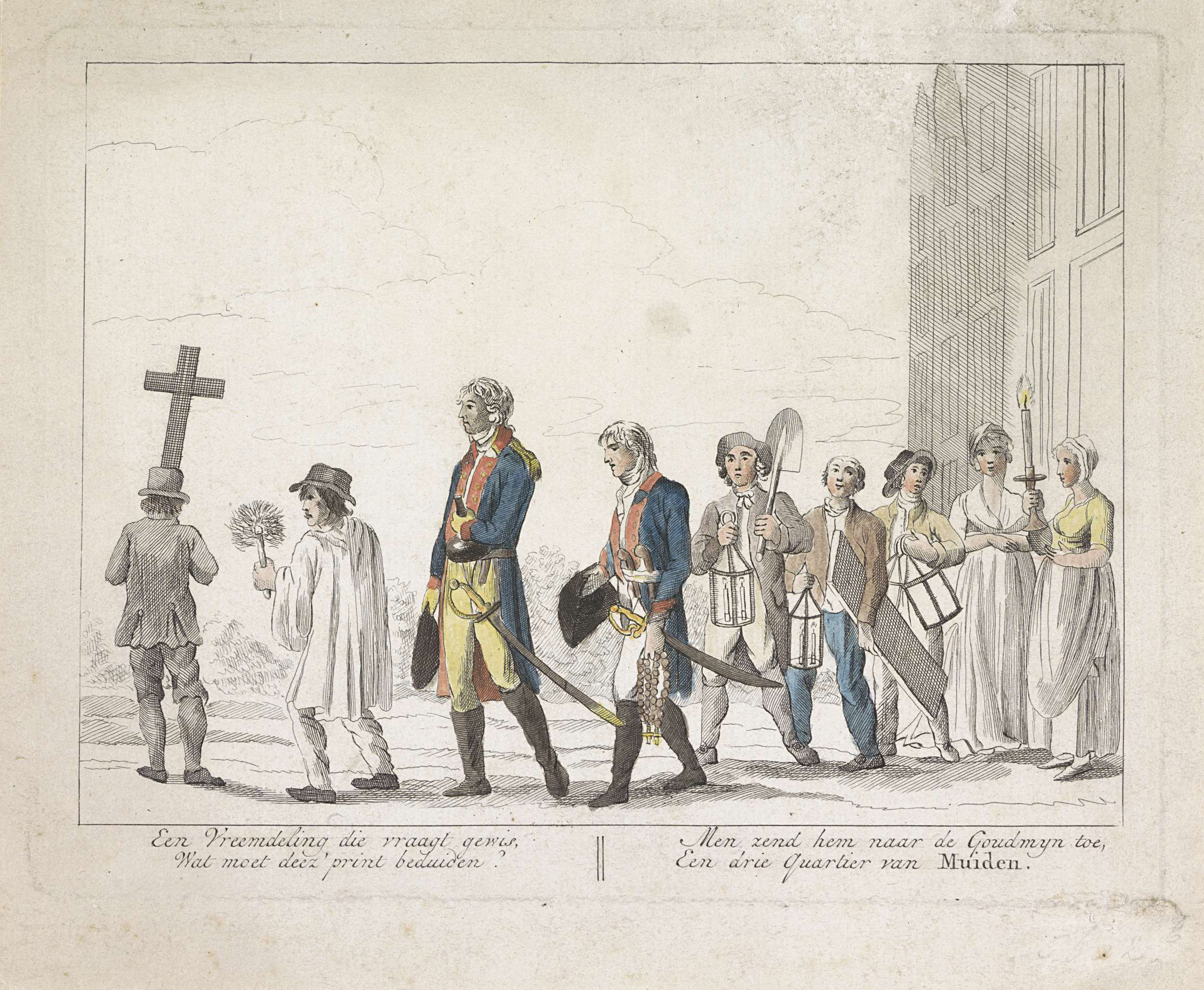 De schatzoekers van Muiden vertrekken in processie in de richting van de plaats van de vermeende schat. Vooraan draagt een man een kruis, daarachter de Duitse oplichter met een wijwaterkwast. Illustratie van het verhaal van het bedrog van de bijgelovige katholieke luitenant-kolonel Dirk Cornelis van der Meulen door een Duitse oplichter, te Muiden in de ...