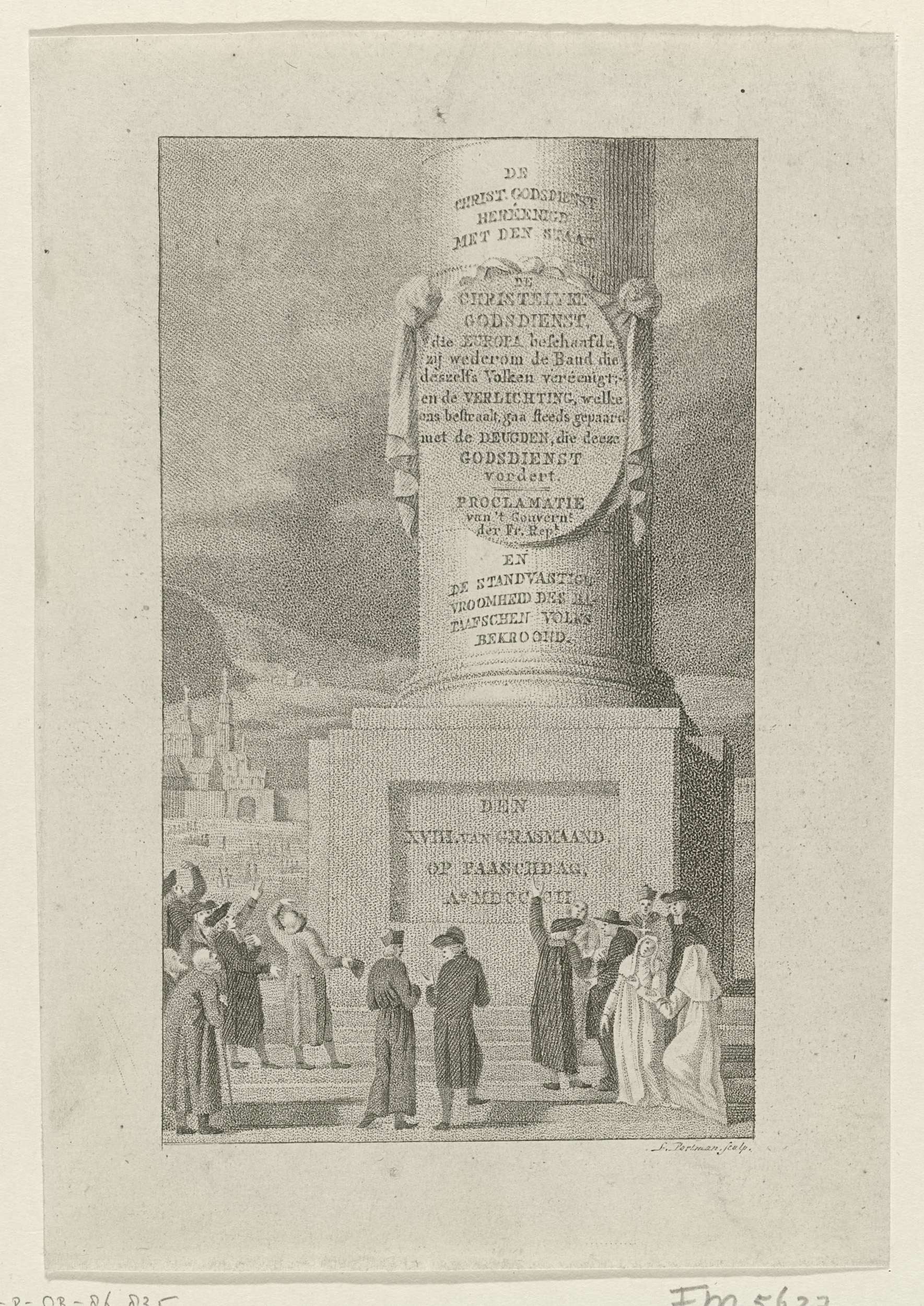 Allegorie op de proclamatie van 18 april 1802 waarbij de Christelijke godsdienst in de Franse en Bataafse Republiek werd hersteld. Figuren verzameld rondom een kolom waarop teksten staan.