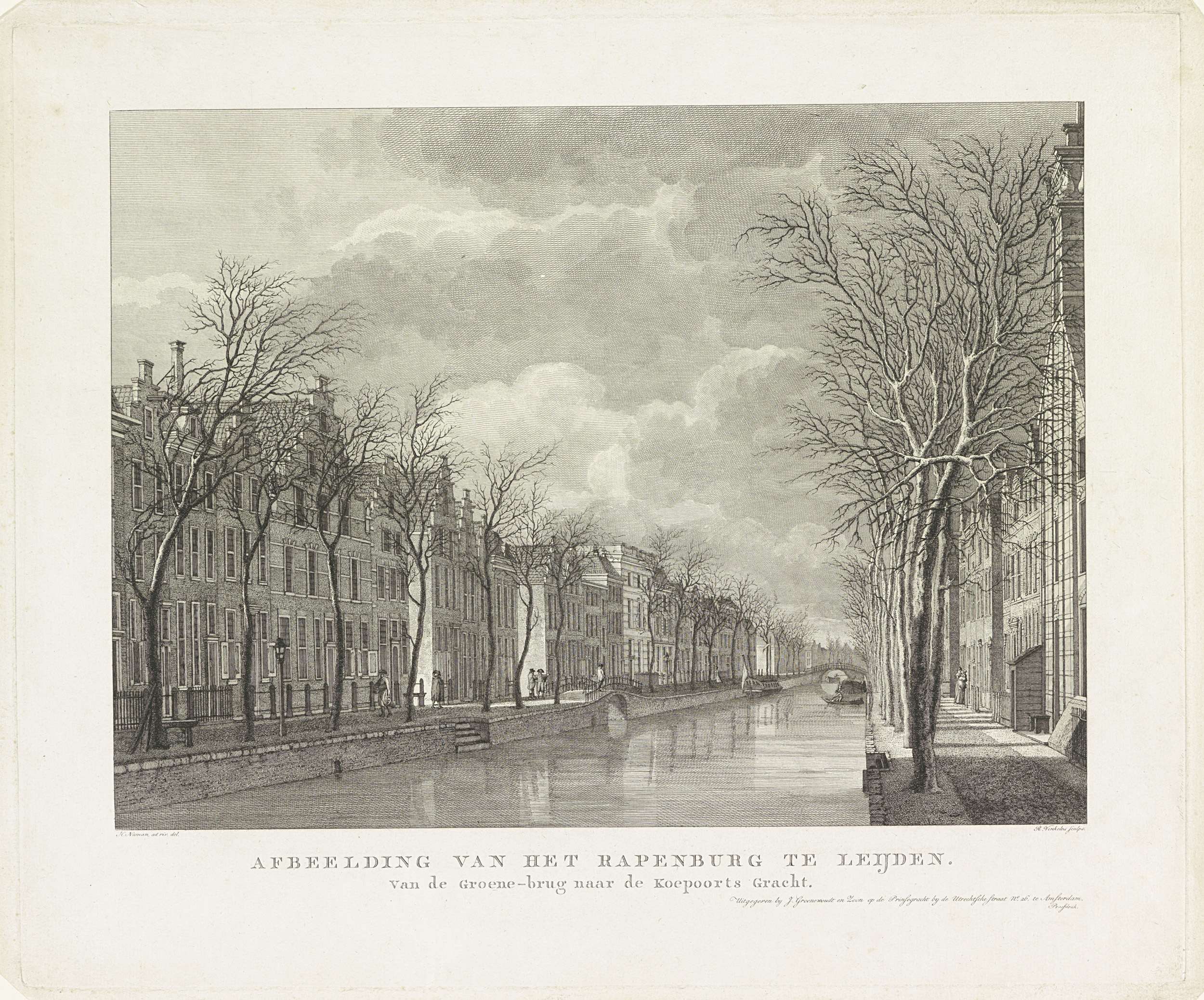 Gezicht op het Rapenburg te Leiden, in welstand vóór de buskruitramp van 12 januari 1807. Dit stuk is eigenlijk het Steenschuur, kijkend vanaf de Groenebrug naar de Nieuwsteegbrug in de verte. Aan de rechteroever ligt het kruitschip afgemeerd. Zie ook de uitgeversprospectus en de verklaring.