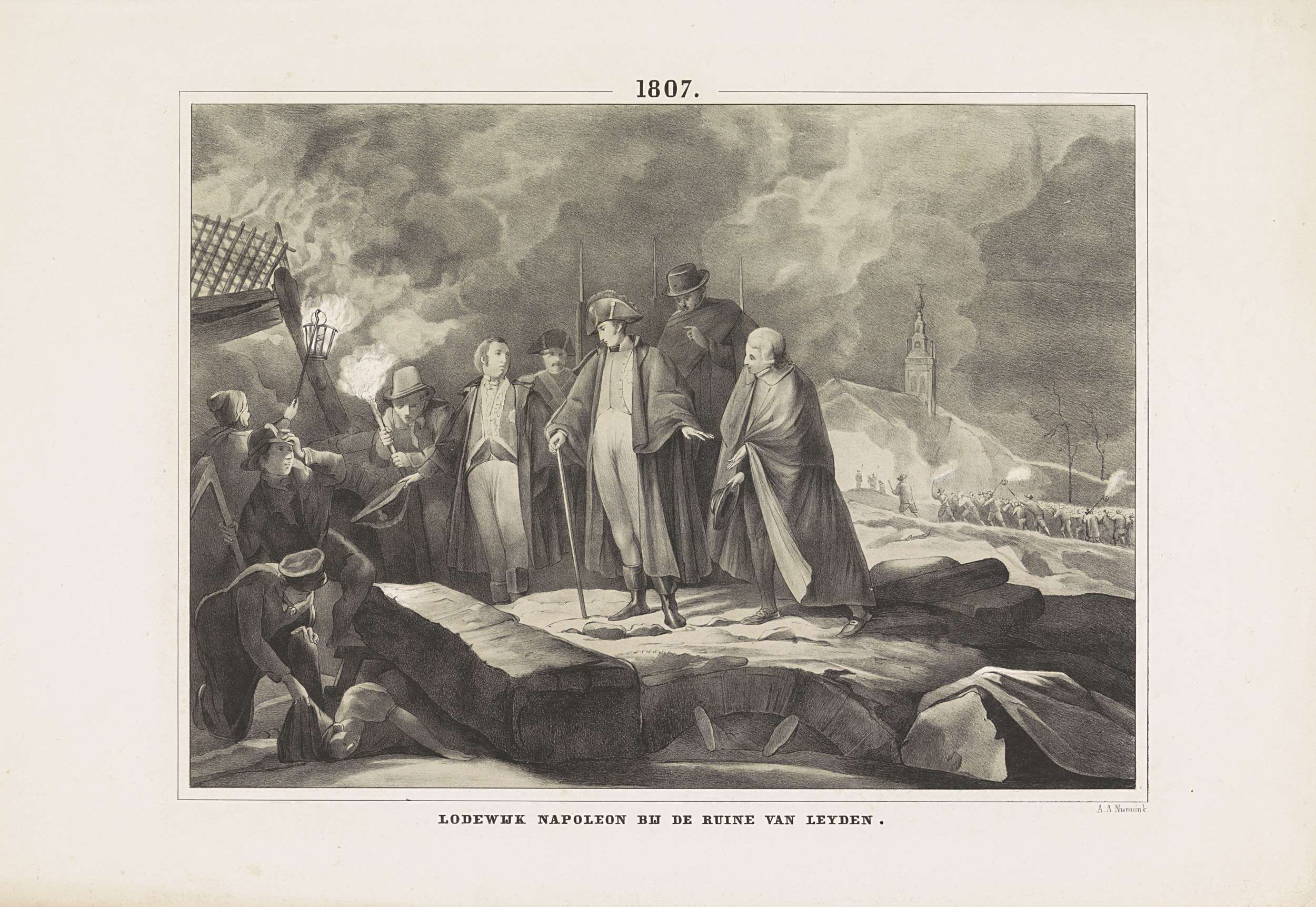 Koning Lodewijk Napoleon bezoekt 's avonds de plaats van de buskruitramp op het Steenschuur, een gracht in het verlengde van het Rapenburg, te Leiden, 12 januari 1807. Op de voorgrond liggen nog slachtoffers onder het puin.