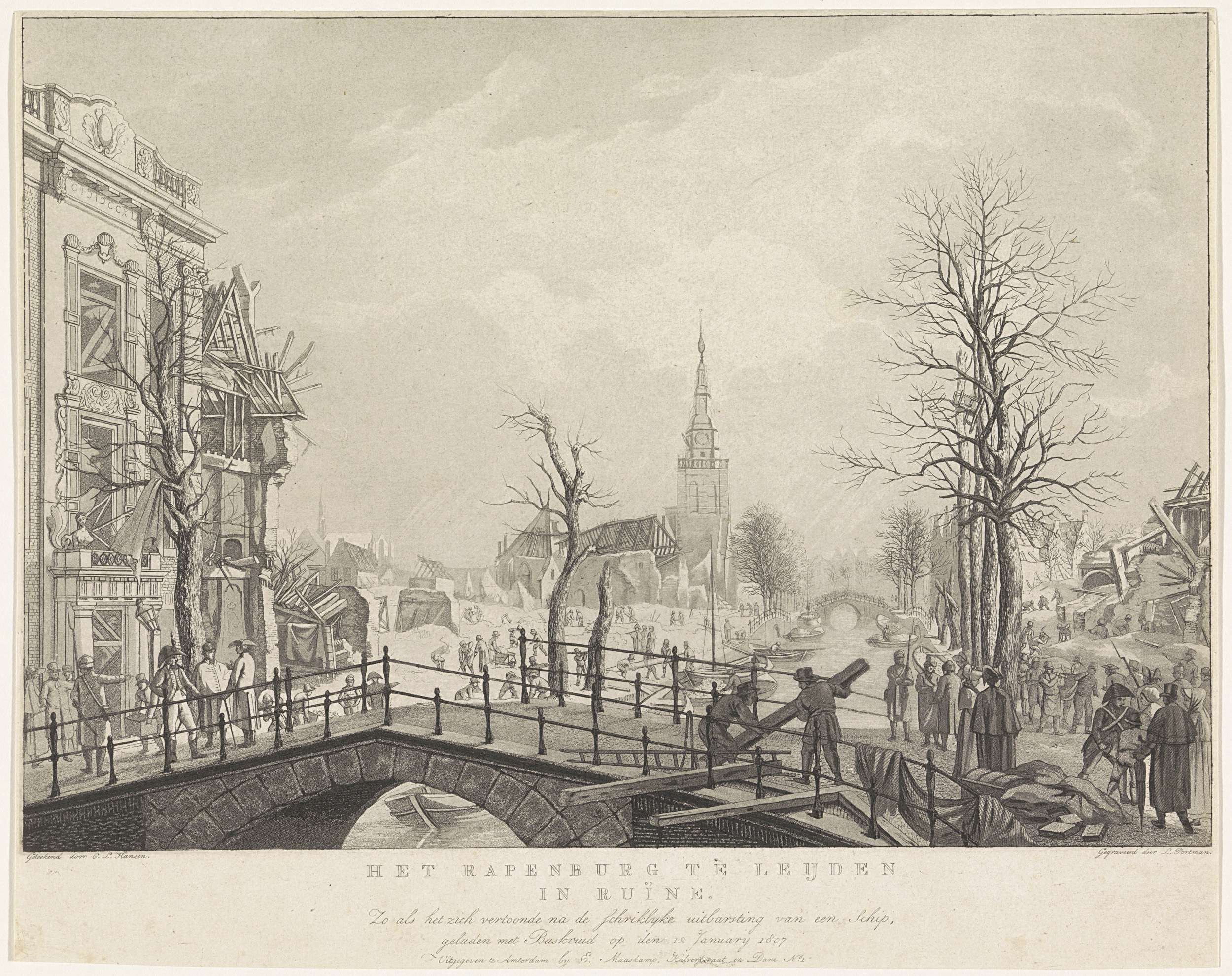 Gezicht vanaf de Nieuwsteegbrug op het verwoest gebied na de buskruitramp op het Steenschuur, een gracht in het verlengde van het Rapenburg, te Leiden op 12 januari 1807. Opruimwerkzaamheden na de ramp, het wegdragen van slachtoffers. Centraal de Saaihal.