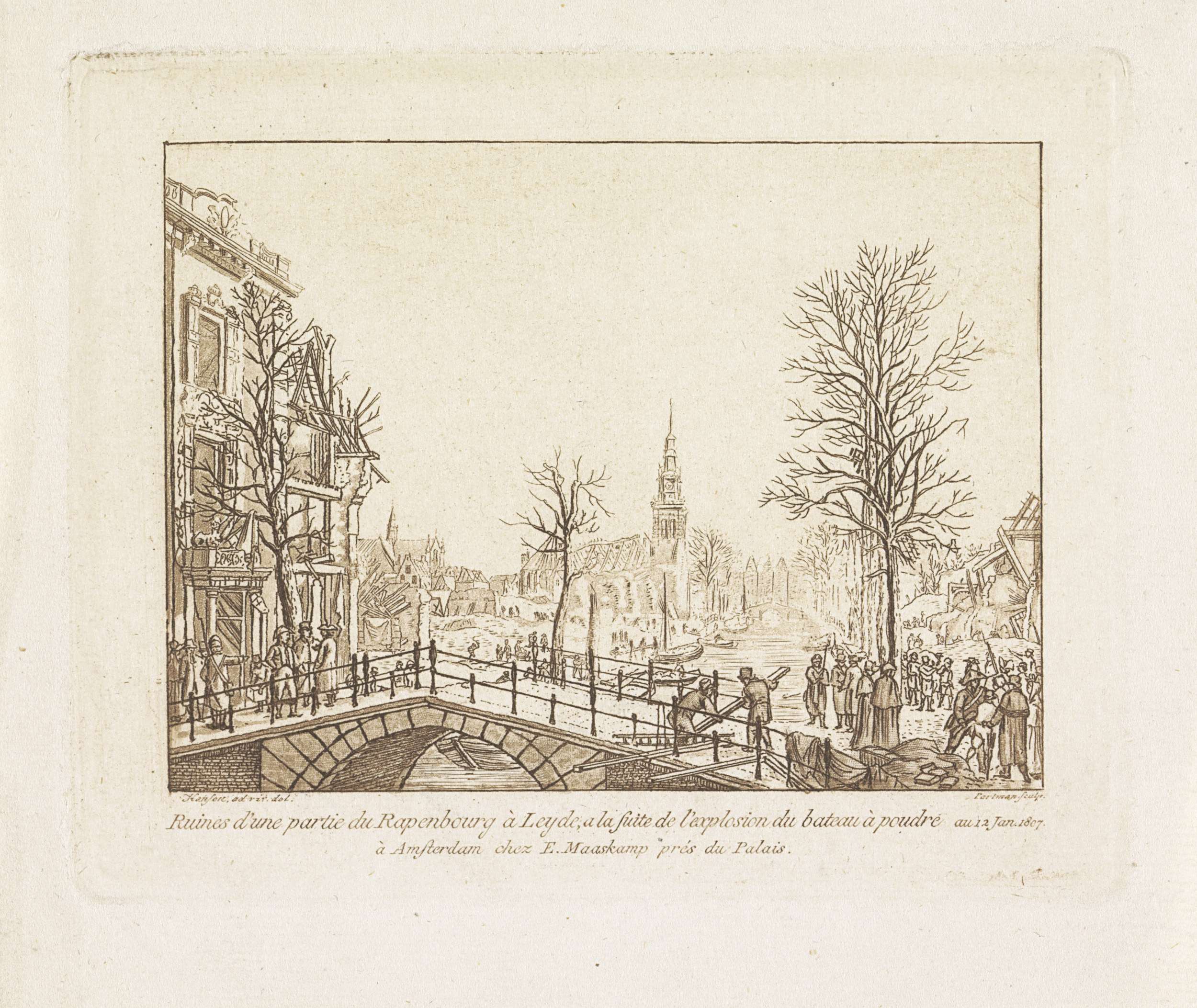 Gezicht vanaf de Nieuwsteegbrug op het verwoest gebied na de buskruitramp op het Steenschuur, een gracht in het verlengde van het Rapenburg, te Leiden op 12 januari 1807. Opruimwerkzaamheden na de ramp, het wegdragen van slachtoffers. Centraal de Saaihal.