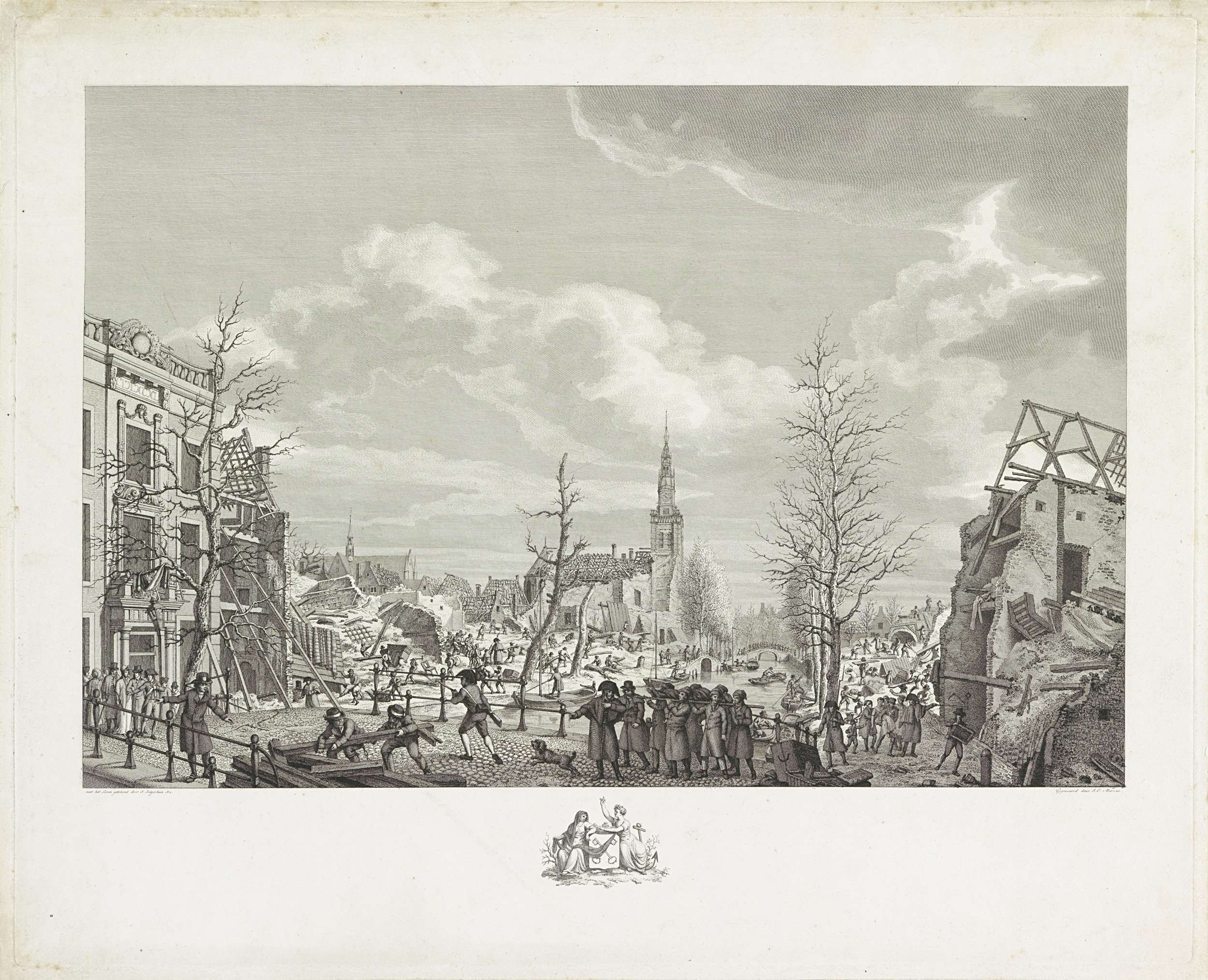 Gezicht vanaf de Nieuwsteegbrug op het verwoest gebied na de buskruitramp op het Steenschuur, een gracht in het verlengde van het Rapenburg, te Leiden op 12 januari 1807. Opruimwerkzaamheden na de ramp, centraal de Saaihal, links in de verte de Pieterskerk. Op de voorgrond wordt het lichaam van een slachtoffer weggedragen. In de marge een ...
