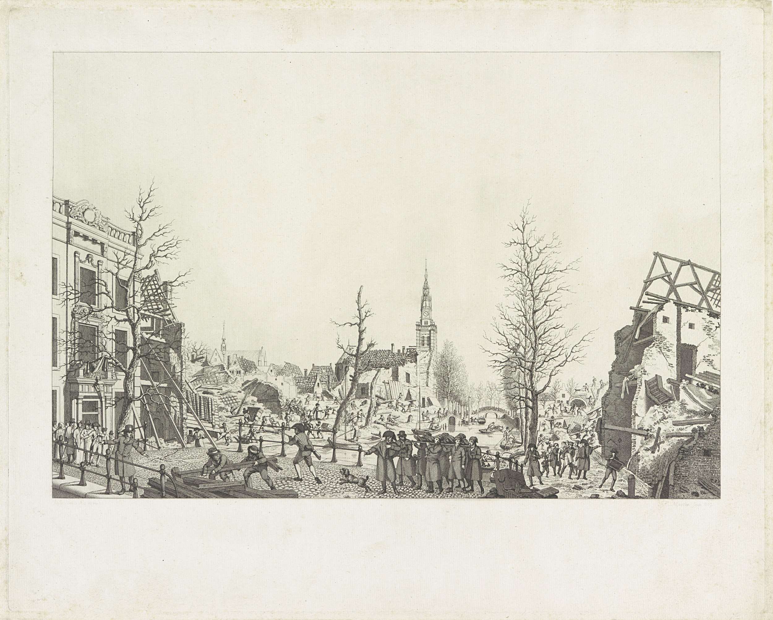 Gezicht vanaf de Nieuwsteegbrug op het verwoest gebied na de buskruitramp op het Steenschuur, een gracht in het verlengde van het Rapenburg, te Leiden op 12 januari 1807. Opruimwerkzaamheden na de ramp, centraal de Saaihal, links in de verte de Pieterskerk. Op de voorgrond wordt het lichaam van een slachtoffer weggedragen.