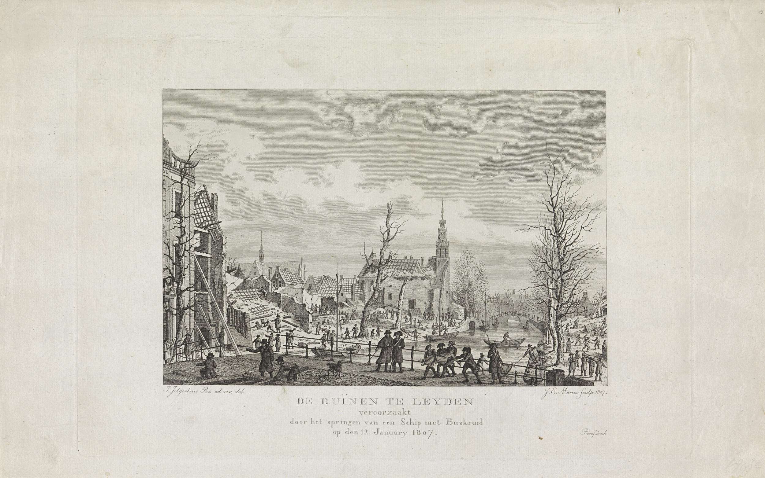 Gezicht vanaf de Nieuwsteegbrug op het verwoest gebied na de buskruitramp op het Steenschuur, een gracht in het verlengde van het Rapenburg, te Leiden op 12 januari 1807. Opruimwerkzaamheden na de ramp, centraal de Saaihal, links in de verte de Pieterskerk. Op de voorgrond wordt het lichaam van een slachtoffer weggedragen.