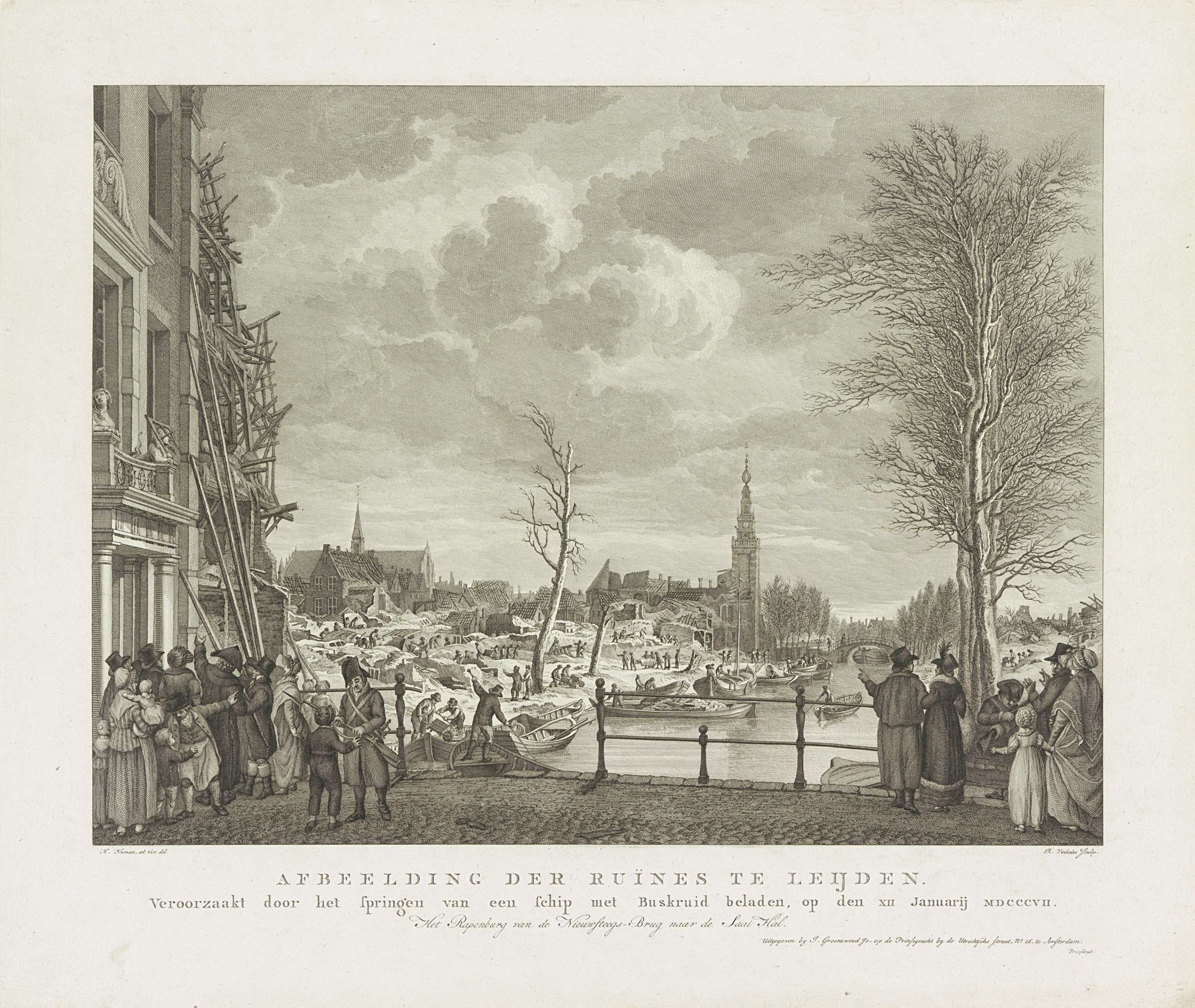 Gezicht vanaf de Nieuwsteegbrug op de herstelwerkzaamheden in het verwoeste gebied na de buskruitramp op het Steenschuur, een gracht in het verlengde van het Rapenburg, te Leiden op 12 januari 1807. Links op de voorgrond het huis van schepen J.W. van Noort, op de achtergrond in het midden de Saaihal. Zie ook de verklaring.
