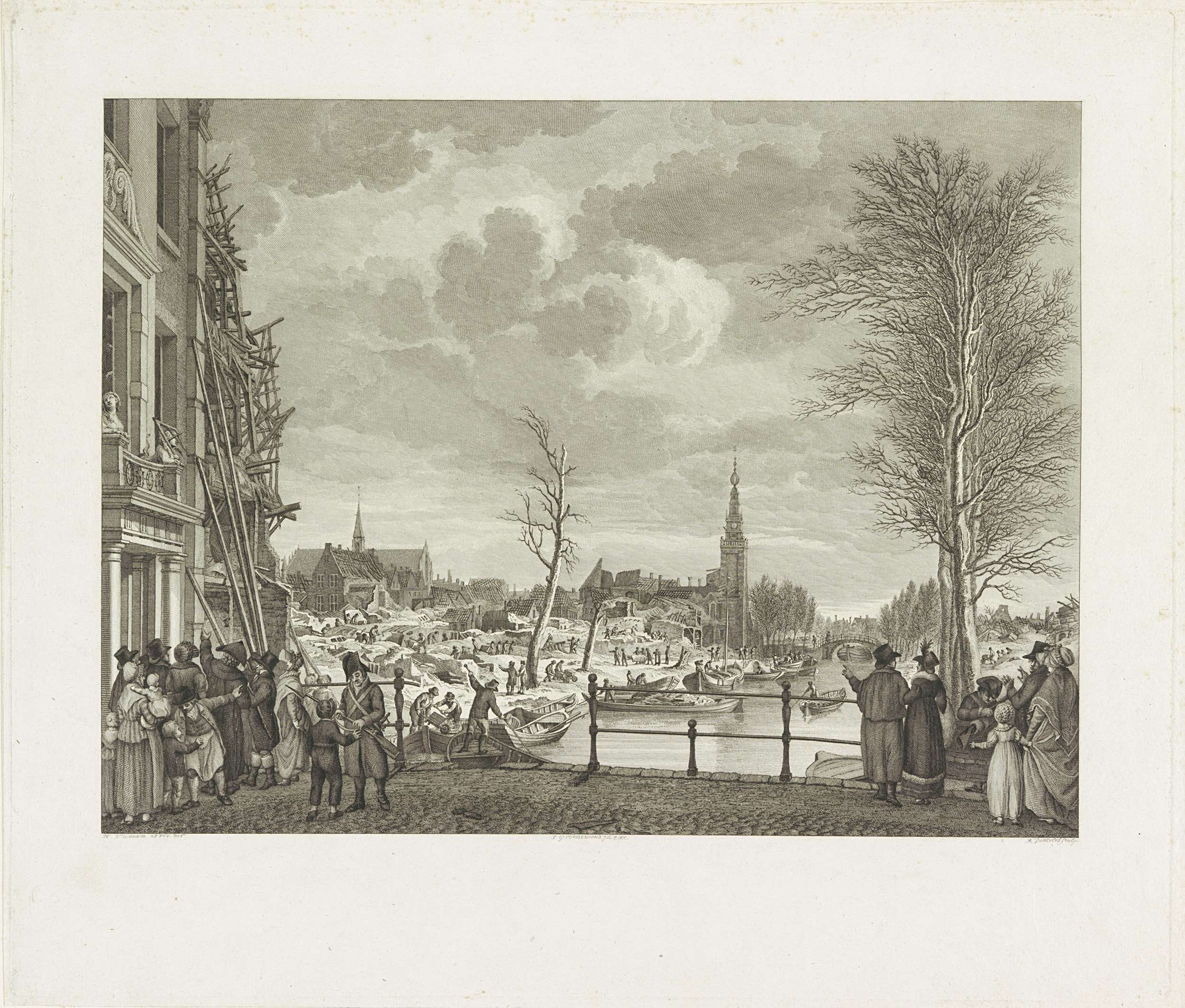 Gezicht vanaf de Nieuwsteegbrug op de herstelwerkzaamheden in het verwoeste gebied na de buskruitramp op het Steenschuur, een gracht in het verlengde van het Rapenburg, te Leiden op 12 januari 1807. Links op de voorgrond het huis van schepen J.W. van Noort, op de achtergrond in het midden de Saaihal.