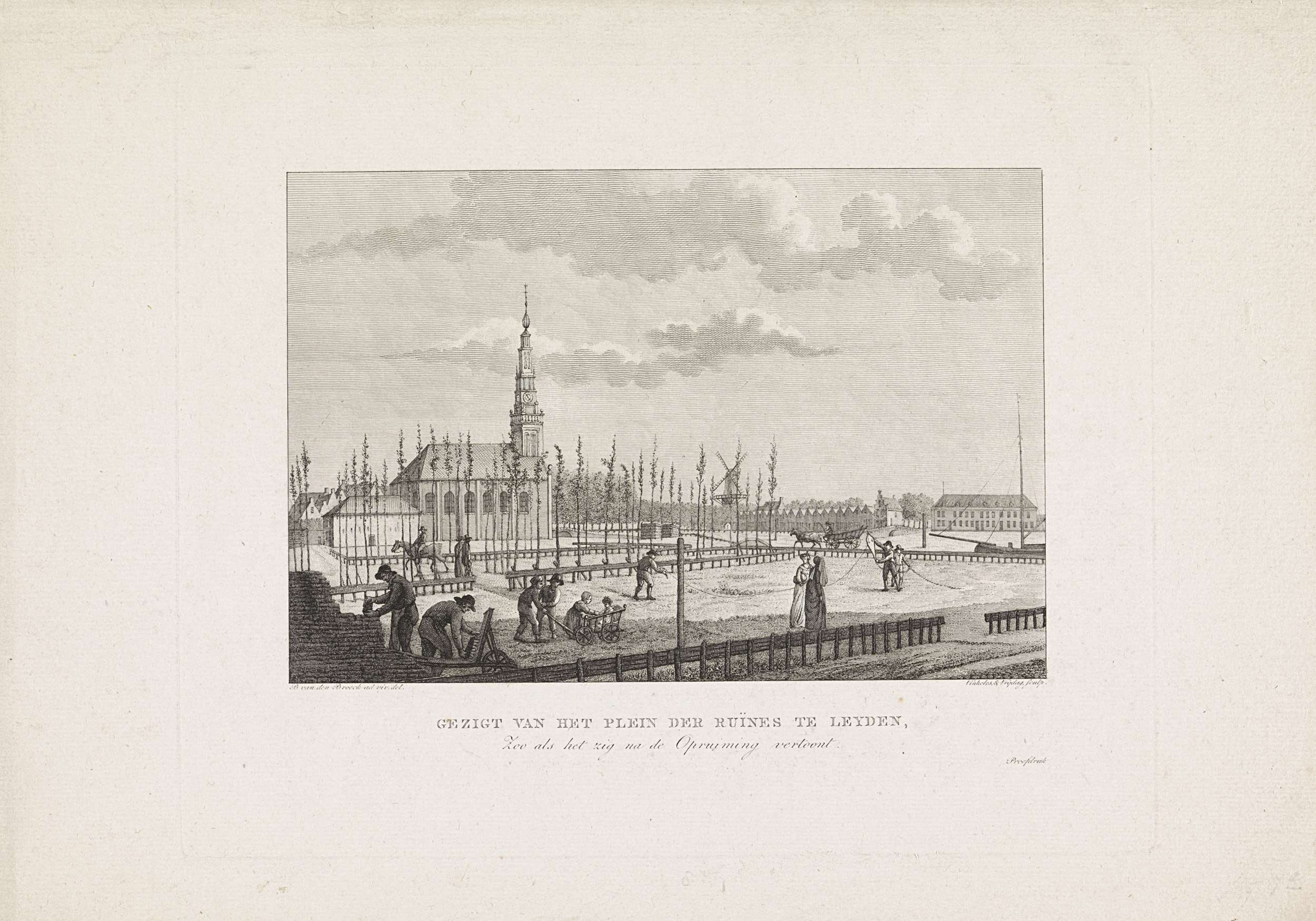 Het Plein der Ruïnes, het gebied aan het Steenschuur te Leiden na de buskruitramp op 12 januari 1807 waar de ruïnes van de gebouwen zijn van het terrein opgeruimd. Op de voorgrond het aanplanten van een plantsoen, links de Saaihal.