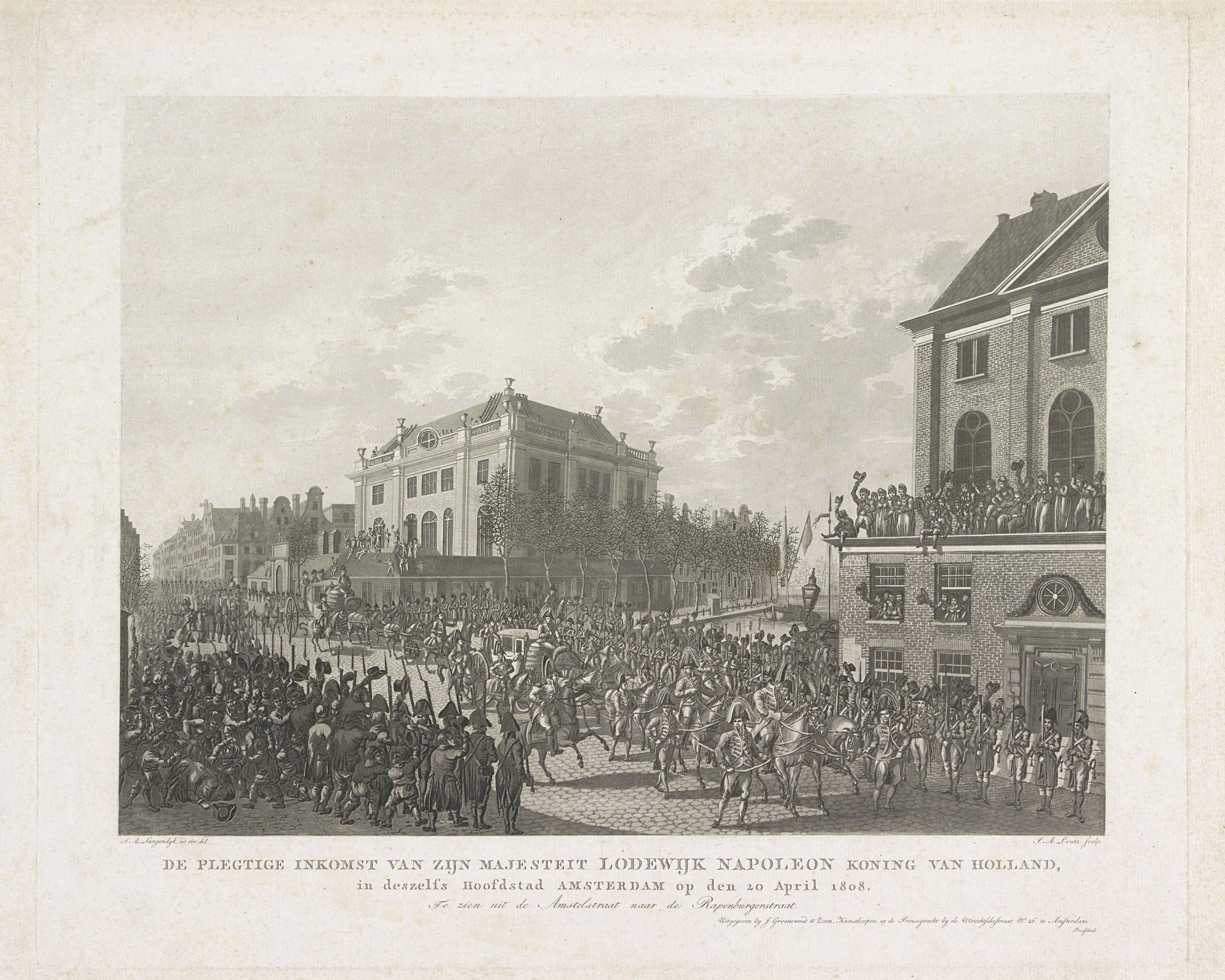 Feestelijke inkomst van Lodewijk Napoleon als koning van Holland te Amsterdam, 20 april 1808. Optocht van twee koetsen met escorte, op straat veel juichende toeschouwers. Gezien vanuit de Nieuwe Amstelstraat. Rechts de Portugees-Israëlitische Synagoge (thans Mr. Visserplein), rechts vooraan de Grote Synagoge (Nieuwe Amstelstraat).