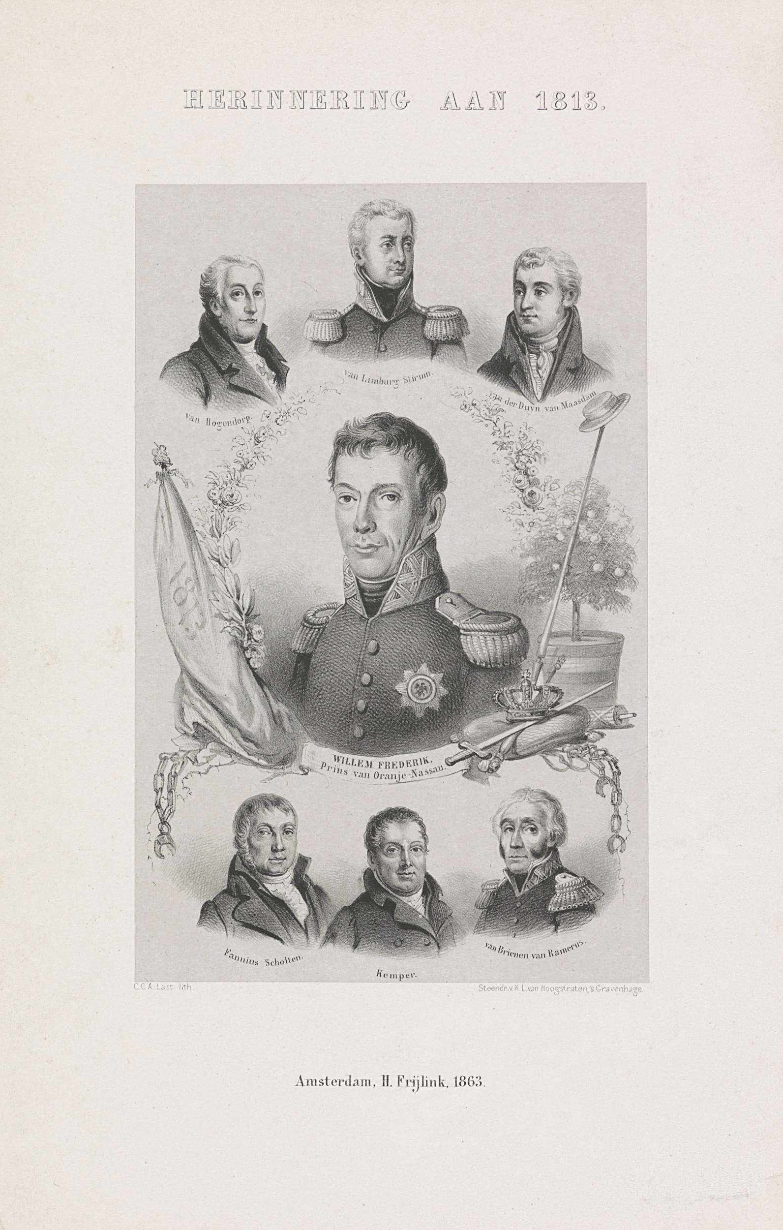 Herdenking in 1863 van het vijftigjarig jubileum van de terugkomst van prins Willem Frederik als souverein vorst naar Nederland in 1813. Centraal het portret van Willem Frederik als prins van Oranje Nassau. Daarboven portretten van het Driemanschap: Van Hogendorp, Van Limburg Stirum en Van der Duyn van Maasdam. Daaronder portretten van: Fannius Scholten, Kemper en ...