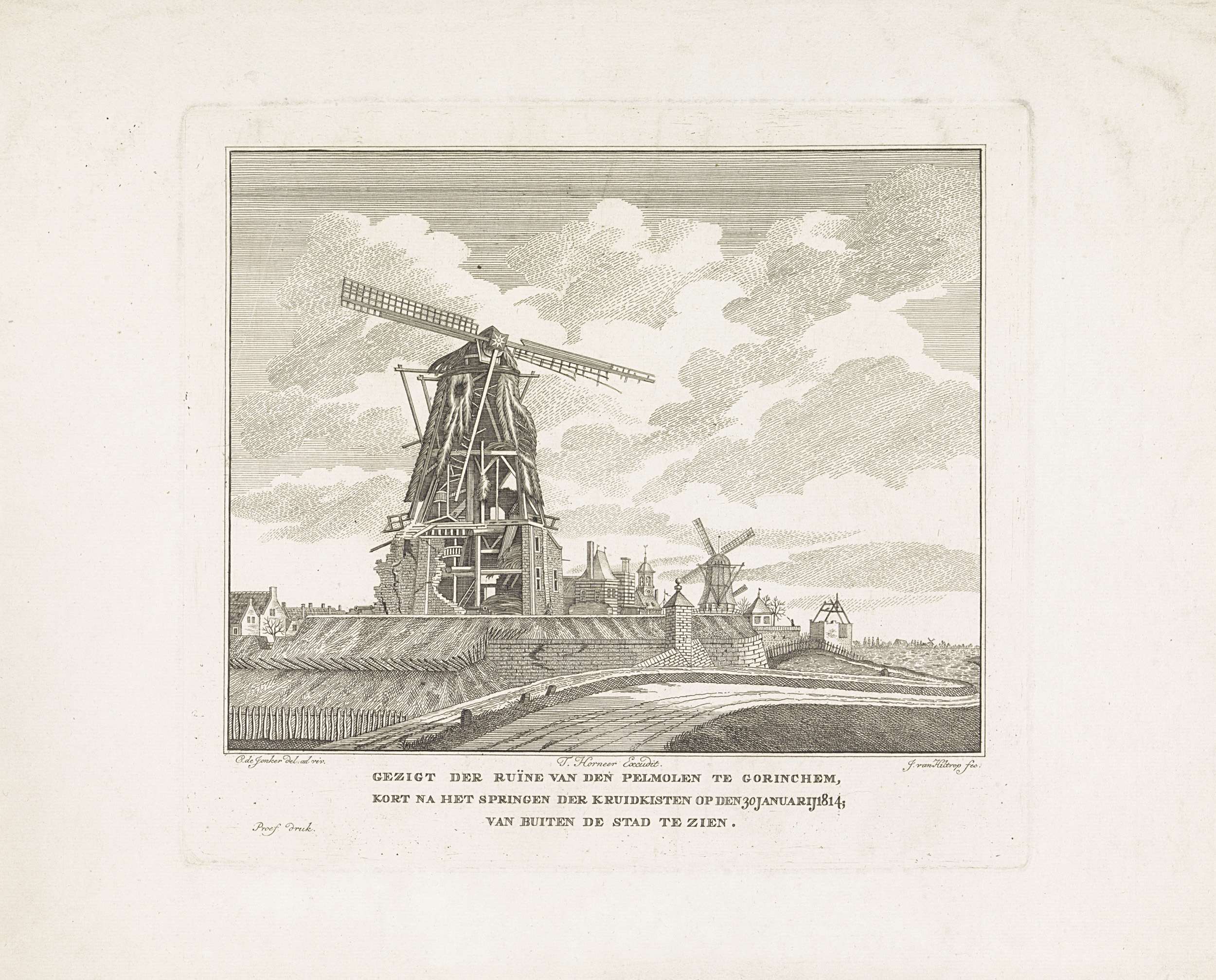 Gezicht op de ruïne van de pelmolen bij de stadswal te Gorinchem, na de buskruitexplosie op 30 januari 1814.