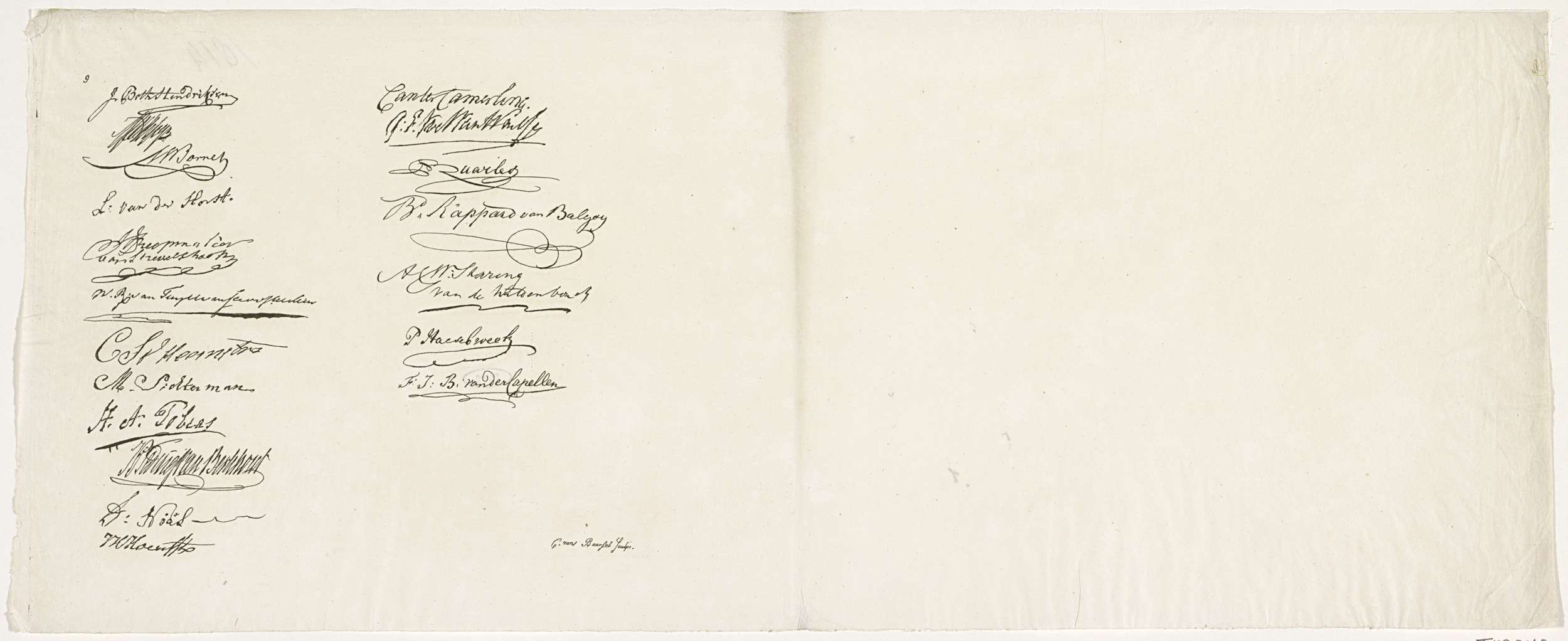 Het laatste blad nr. 9 uit de serie van negen bladen met in facsimile de handtekeningen van de leden van de Vergadering der Aanzienlijken bijeen ter onderhandeling over de nieuwe grondwet, te Amsterdam op 29 maart 1814.