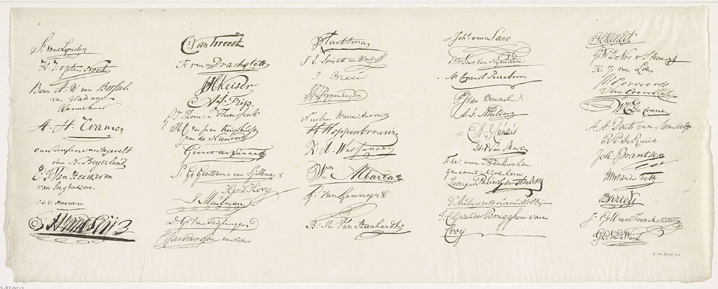 Blad nr. 2 uit de serie van negen bladen met in facsimile de handtekeningen van de leden van de Vergadering der Aanzienlijken bijeen ter onderhandeling over de nieuwe grondwet, te Amsterdam op 29 maart 1814.