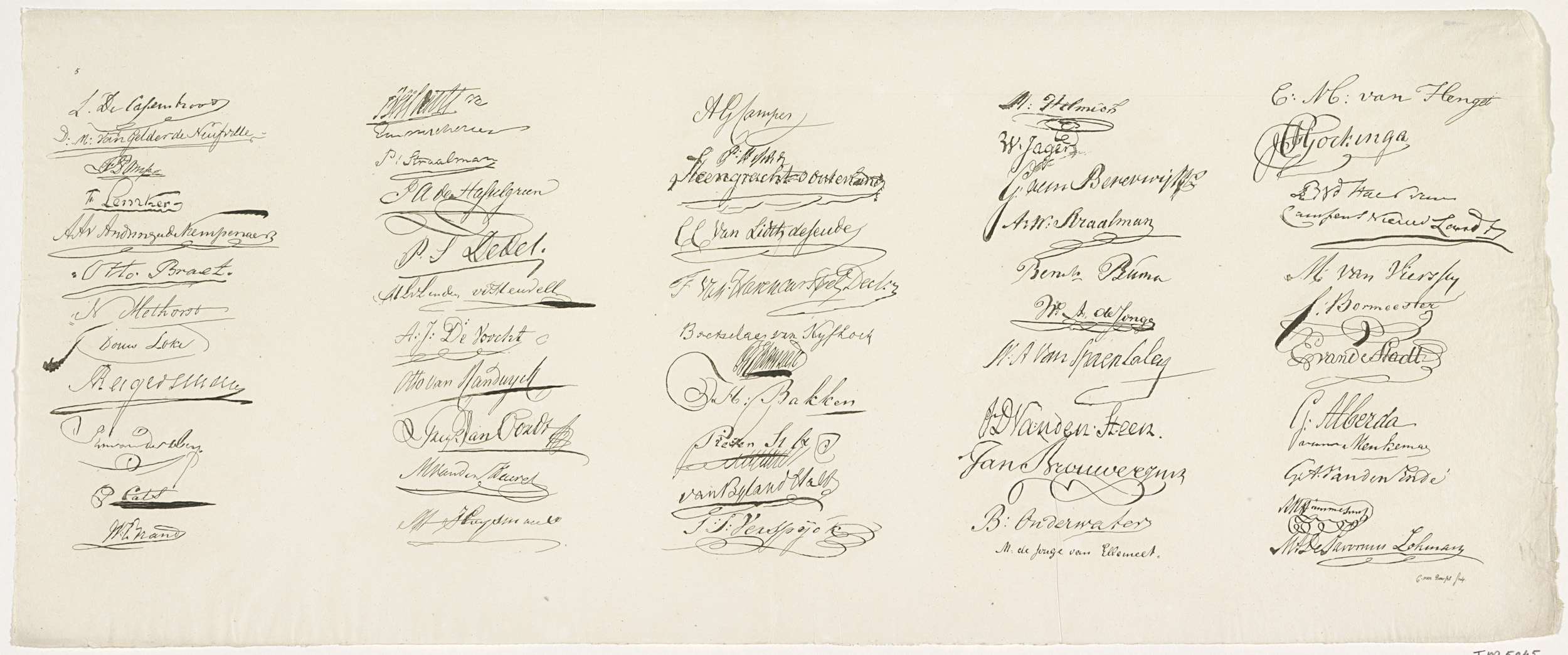 Blad nr. 5 uit de serie van negen bladen met in facsimile de handtekeningen van de leden van de Vergadering der Aanzienlijken bijeen ter onderhandeling over de nieuwe grondwet, te Amsterdam op 29 maart 1814.