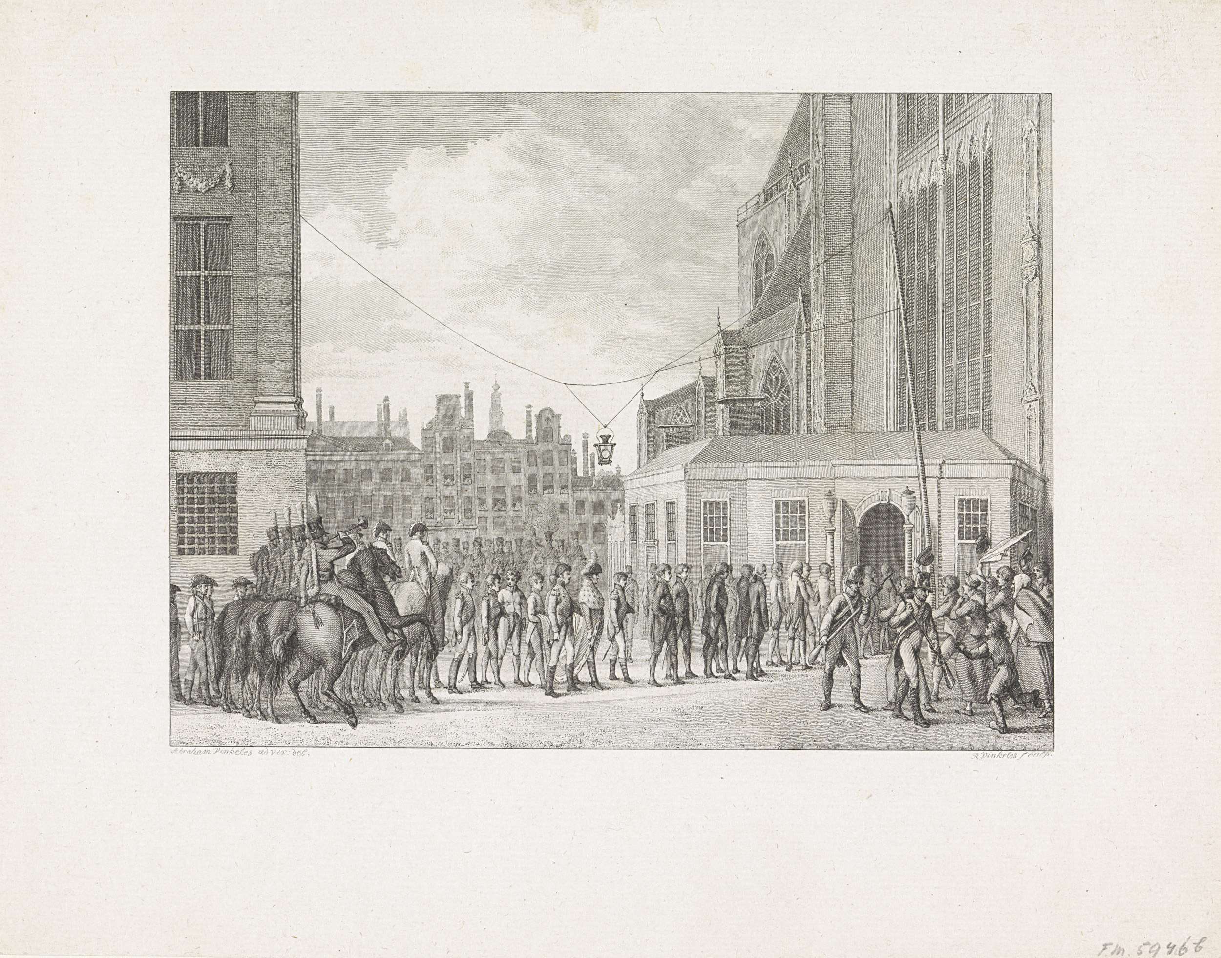 Willem Frederik, prins van Oranje als souverein vorst sluit aan in de stoet van leden van de Vergadering der Aanzienlijken gaande van het Koninklijk Paleis naar de Nieuwe Kerk te Amsterdam op 29 maart 1814. Zie ook de pendant.