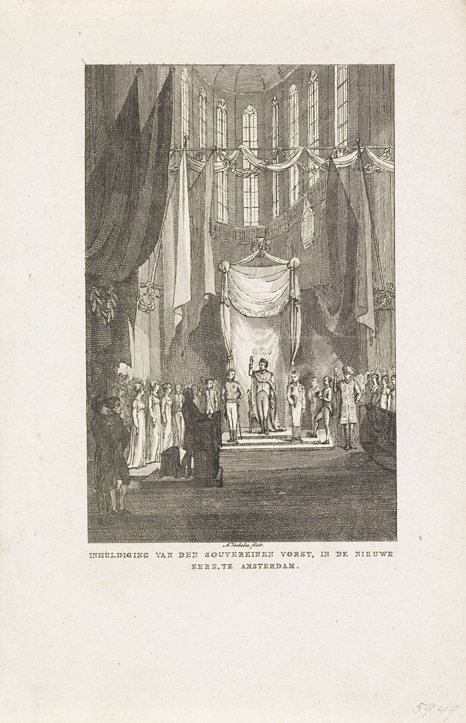 Prins Willem Frederik ingehuldigd als soeverein vorst in de Nieuwe Kerk te Amsterdam op 30 maart 1814. De vorst legt staande tussen zijn twee zoons de eed af op de grondwet.