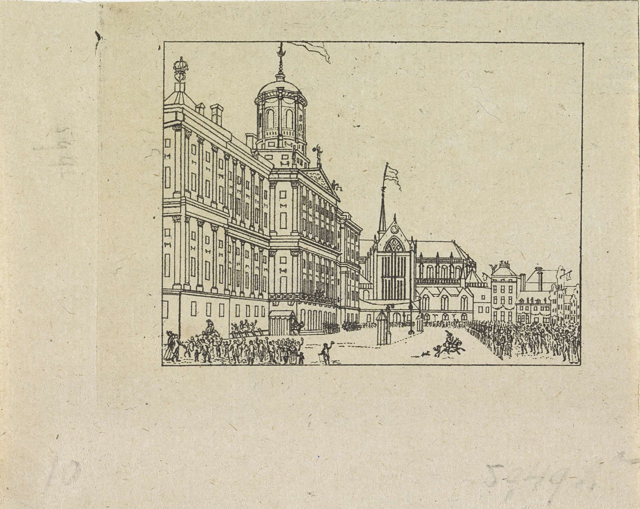 Enkele figuren groeten vanaf het balkon aan de voorzijde van het Koninklijk Paleis de menigte op de Dam te Amsterdam. Waarschijnlijk onderdeel van de gebeurtenissen rond de inhuldiging van Willem Frederik, prins van Oranje als souverein vorst in de Nieuwe Kerk te Amsterdam op 30 maart 1814.