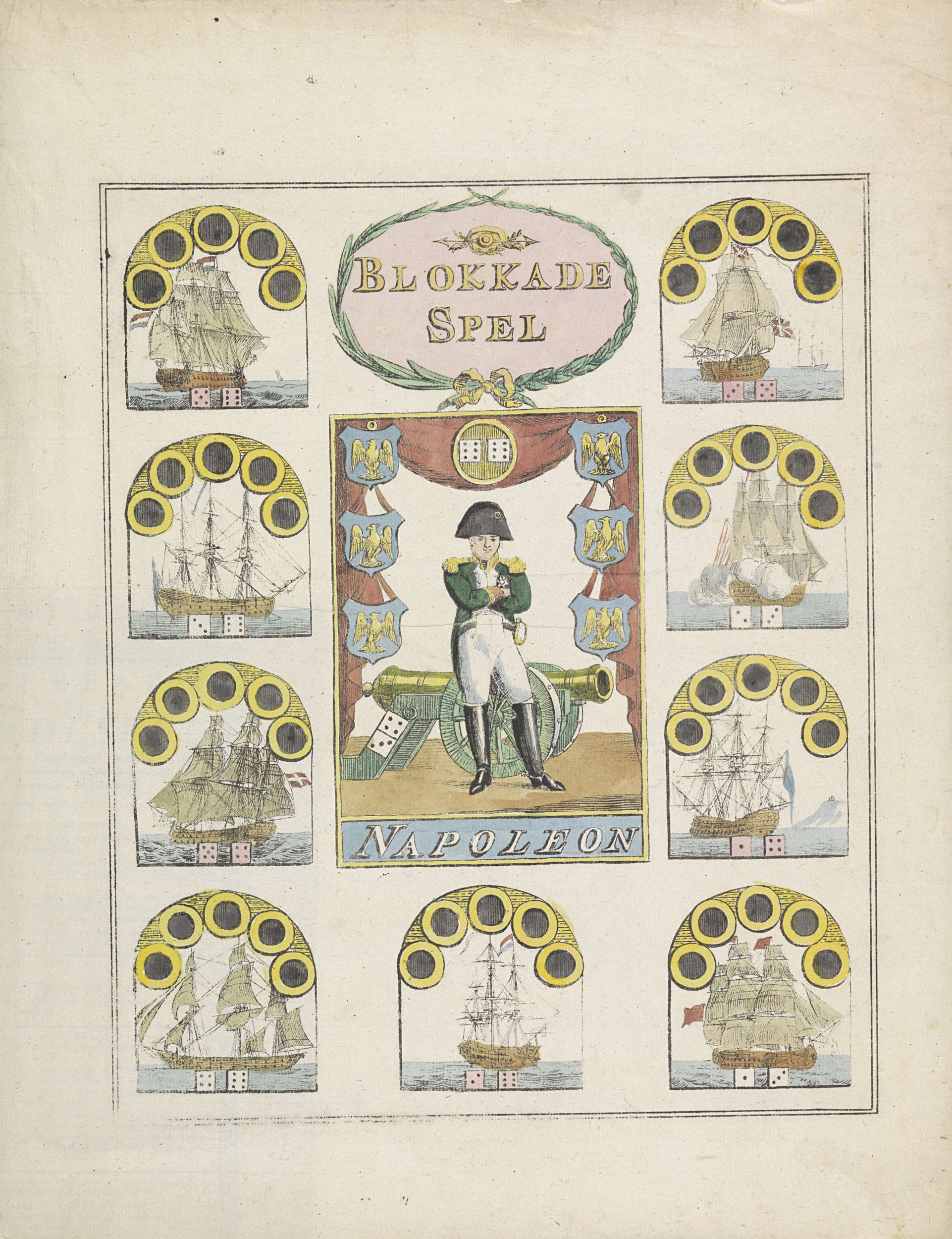 Bordspel gebaseerd op Napoleons verbanning naar Elba, mei 1814. In het midden Napoleon staande voor een kanon. Hieromheen negen vakken waarin de oorlogsschepen van de bondgenoten die de blokkade om het eiland Elba vormen. Bij de prent behoort een afzonderlijk blad met de spelregels.
