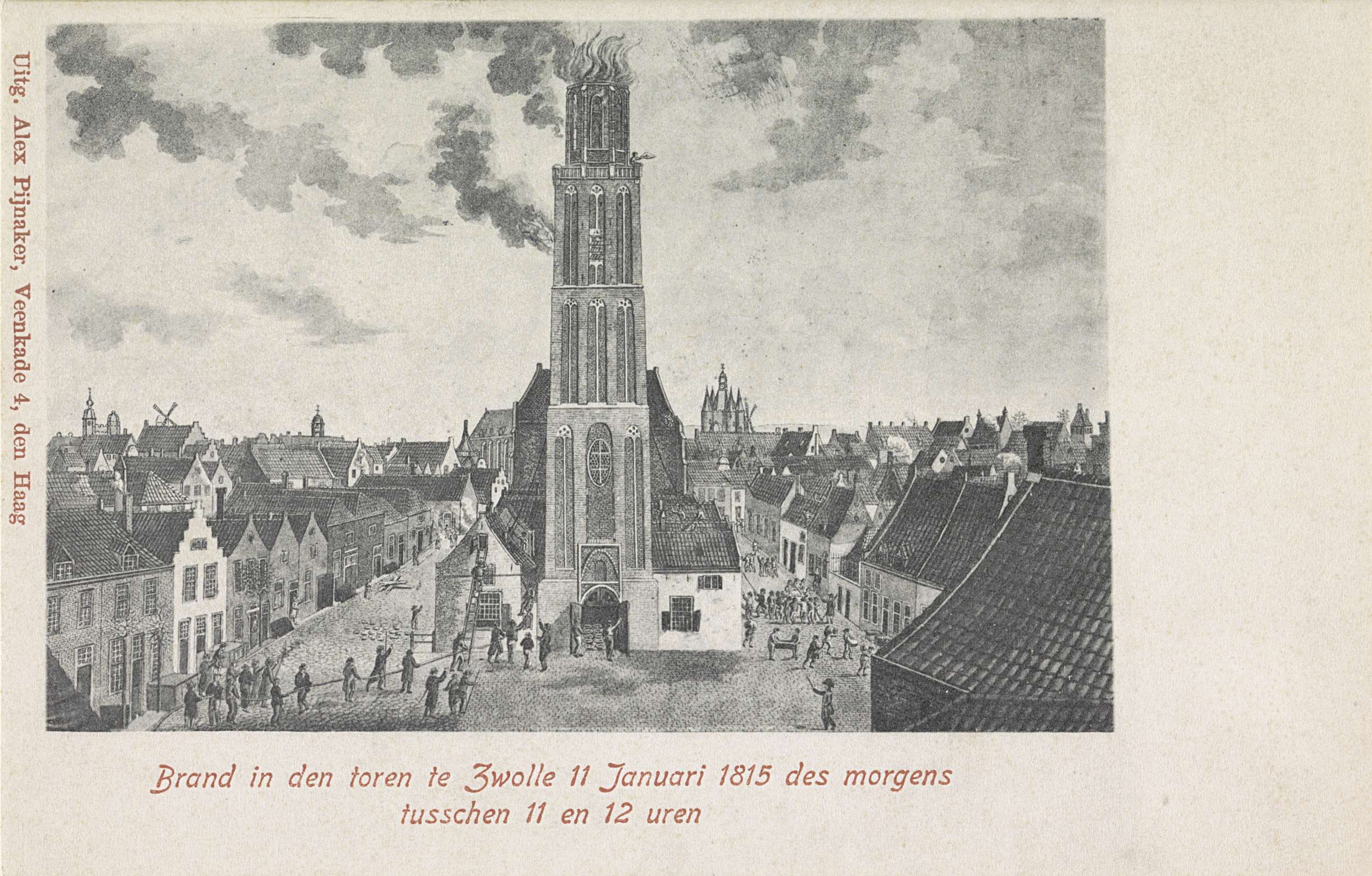 Reproductie van de prent uit 1815 met de brand in de Peperbus, de toren behorende bij de basiliek van Onze-Lieve-Vrouw-Tenhemelopneming, te Zwolle op 11 januari 1815.
