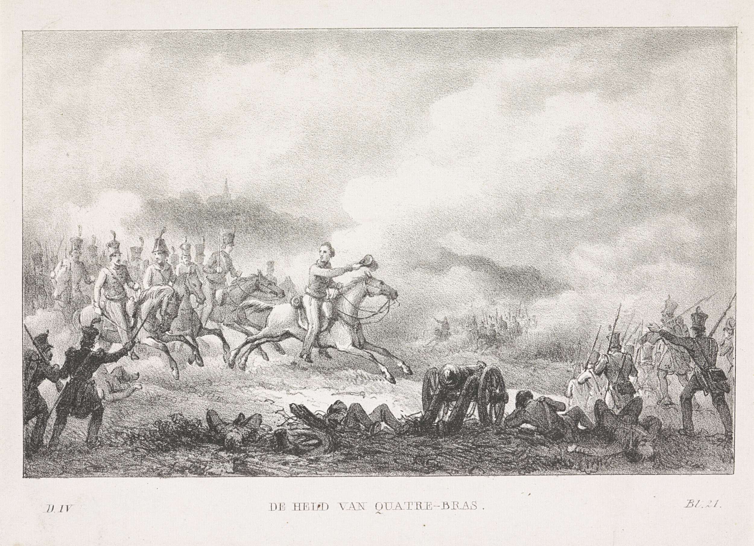 Willem Frederik George, prins van Oranje, leidt de aanval van de Nederlandse troepen tegen de Fransen in de slag bij Quatre-Bras, 16 juni 1815. Gemerkt 'Dl. IV / Bl. 21'.