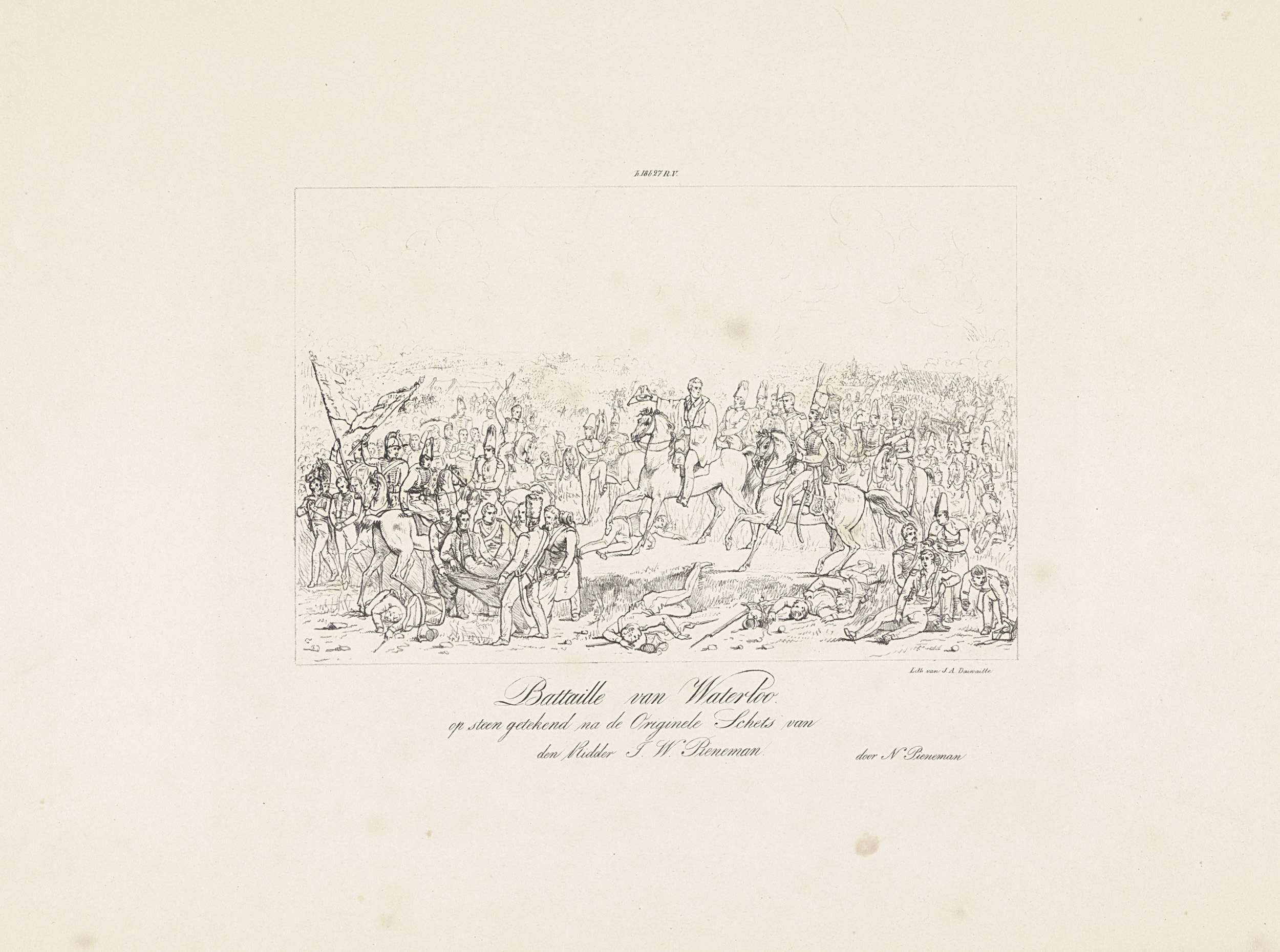 De slag bij Waterloo, 18 juni 1815. Gezicht op het slagveld op het moment waarop de Engelse bevelhebber Wellington hoort dat Pruisische hulp onderweg is. De gewonde Willem, prins van Oranje, wordt links op de voorgrond weggevoerd. De bevelhebbers en andere officieren te paard staan in het midden, rechts op de voorgrond gewonde en dode ...